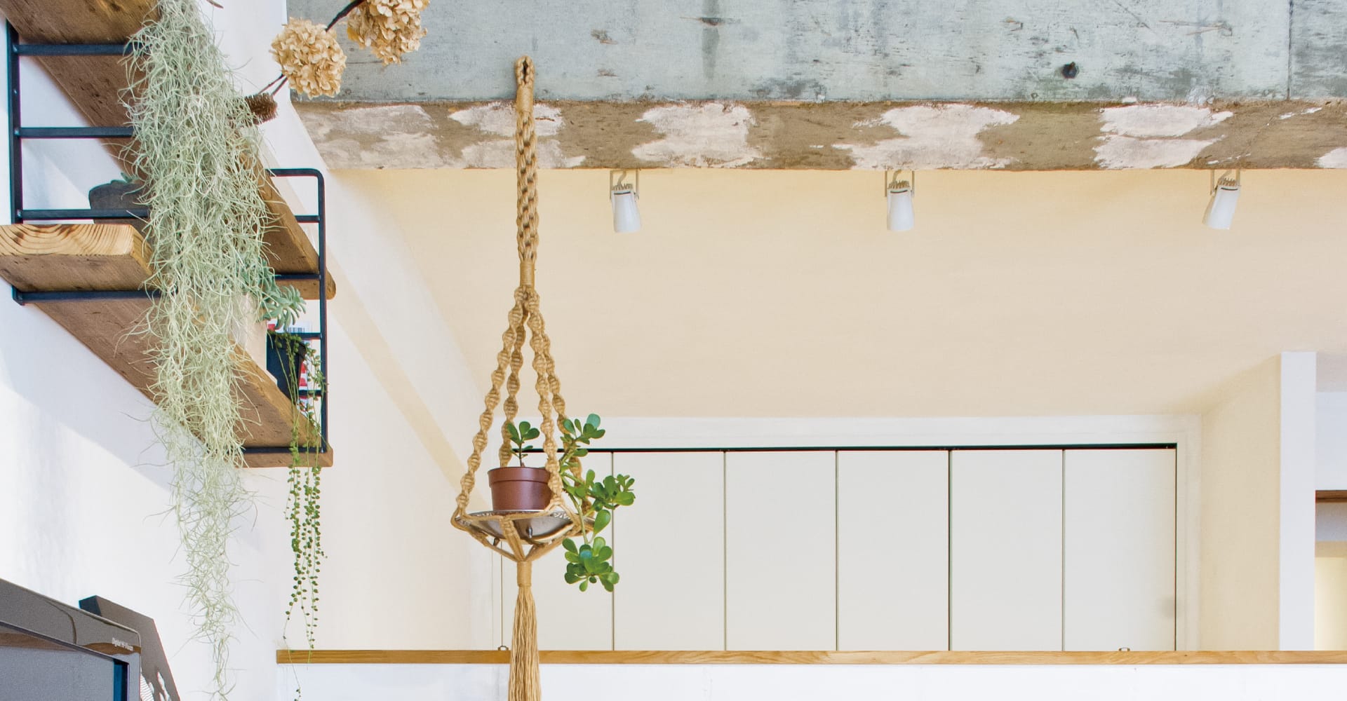 壁はペイントで仕上げて手仕事の味わいを。塗り残しの梁はヴィンテージ感を演出。