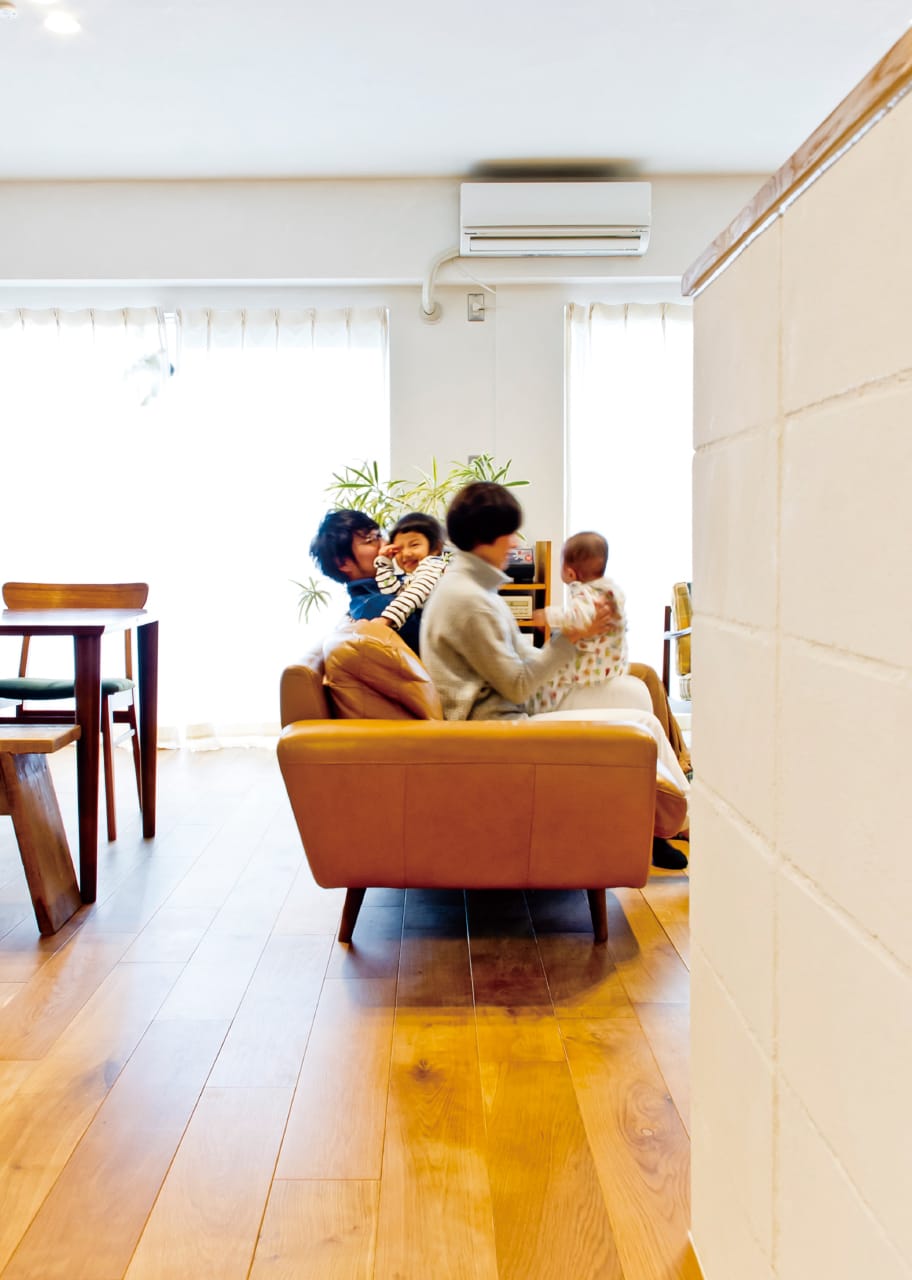 開放的な広いリビングにキッチンもオープンにレイアウトし、目が届く場所に胸の高さの壁で仕切ったプレイスペースを配置。「家事に集中していても子どもの気配を感じる住まいにしたかったんです。無垢材の床にペイント仕上げの壁、オールステンレスのキッチンやコンクリートブロックの間仕切りなど持っていた家具のイメージに合わせてデザインしてもらいました。」Standardのオフィスがお気に入りで、参考にさせてもらったところも多いとの事。「塗り残したコンクリートの梁がお気に入りで、ヴィンテージな感じがいいですね。」使い込むほどに風合いが増す、素材と手仕事の温もりを感じる空間となりました。