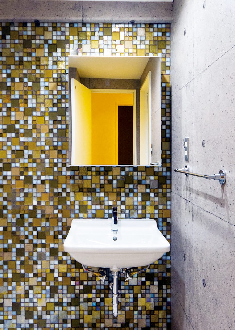 洗面は、シンプルな鏡とタイルの組み合わせで、