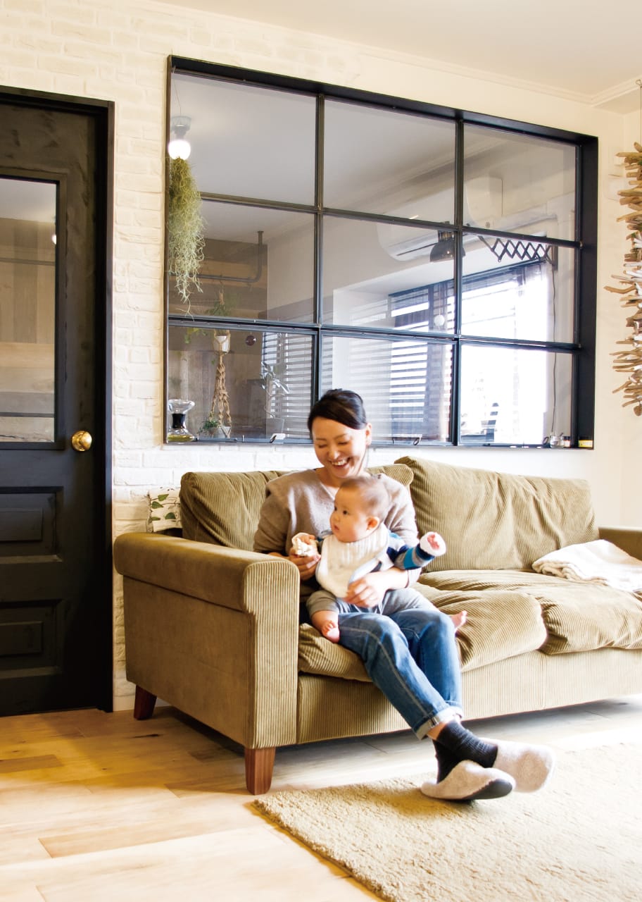 100m2超の物件、リビング隣の部屋の壁にアイアン窓を入れるコトで