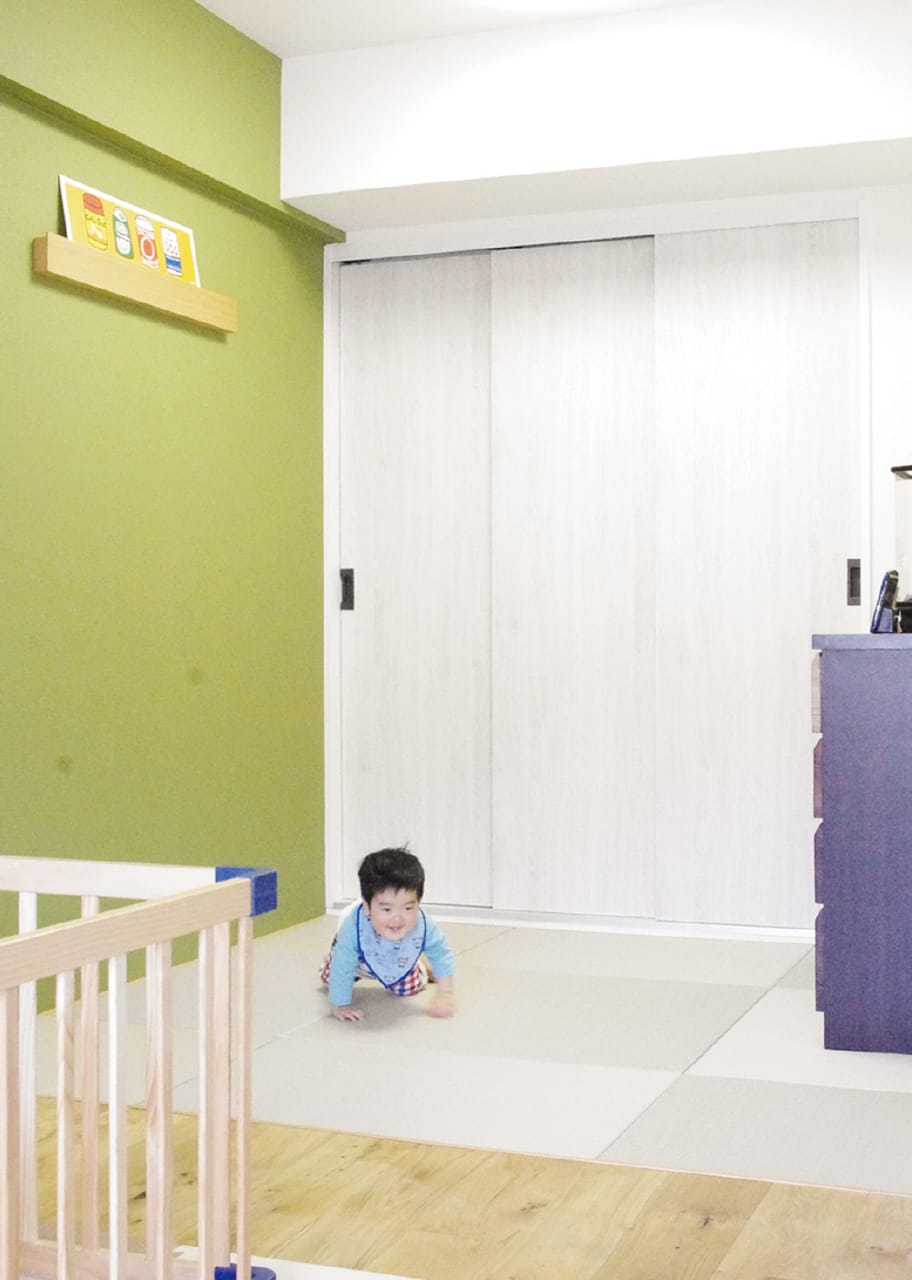 オリーブ色の壁と縁なしのデザイン畳ですっきりとした和室に。
