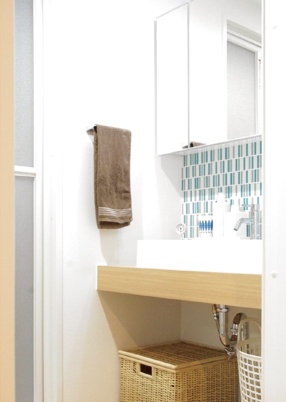 理想としていたのは北欧スタイルのかわいい住まい。映画「かもめ食堂」に出てくるお店のような空間だった。DKのアイスブルーに塗装した板張りのキッチン&カップボードは、映画のお店の色を忠実に再現。アイアンのハンドルや木製のハンガーなど、パーツ一つ一つにまでこだわりを取り入れている。