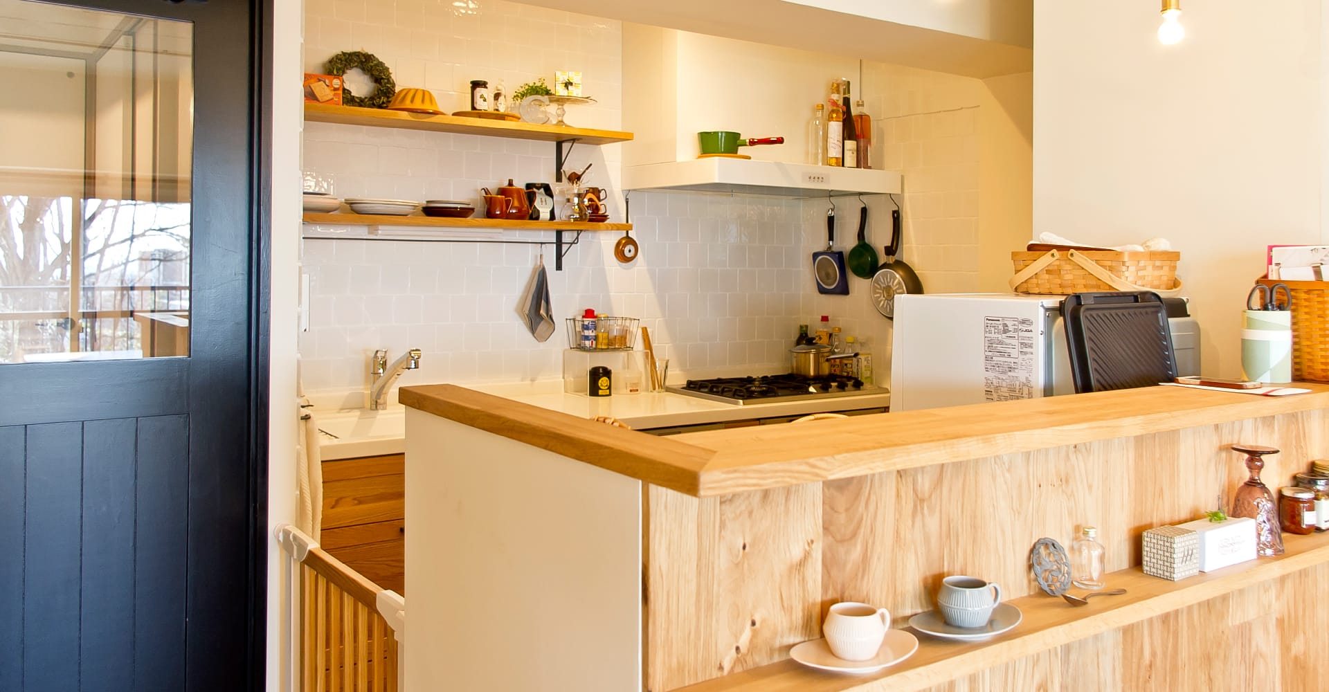 キッチンカウンターの無垢材とアンティークドアが空間に温かみをもたらします。