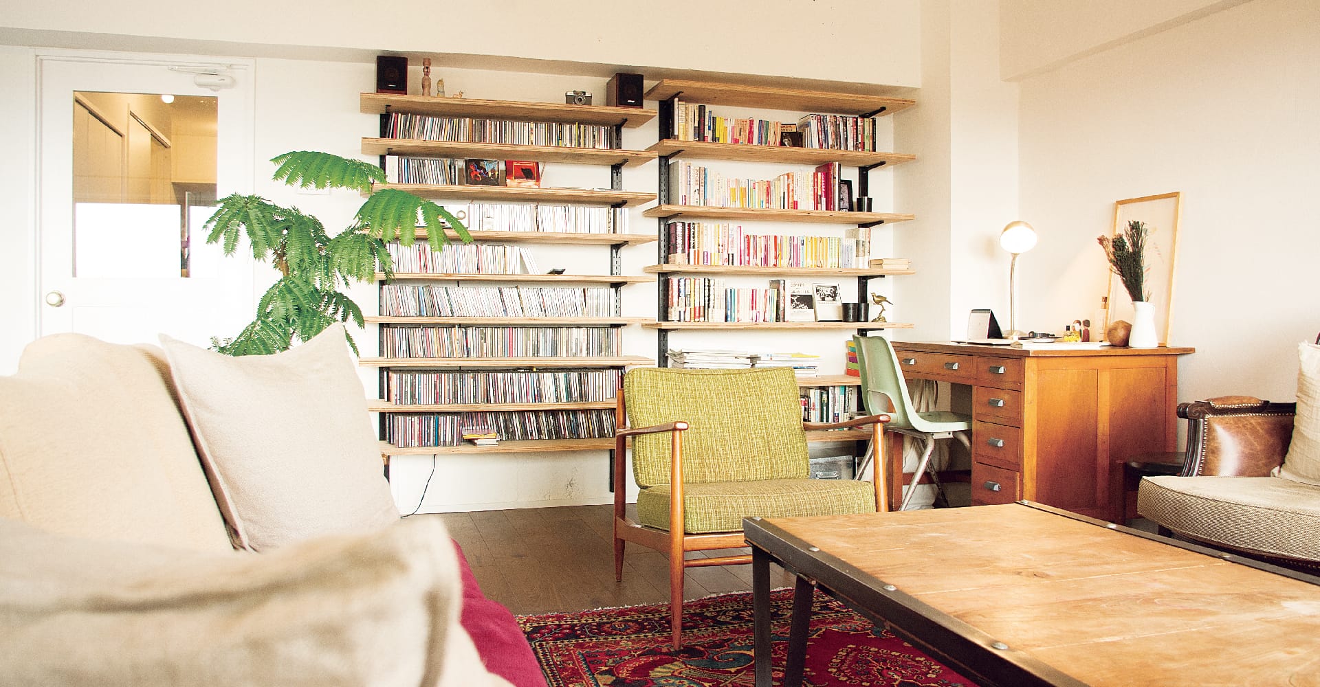 その隣には壁一面の造作棚を設置し、好きな本やCDは見せる収納に。