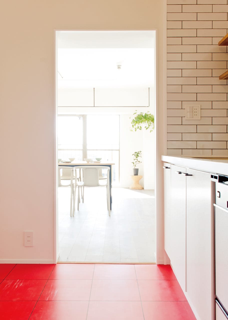 キッチン床は真っ赤にして遊び心を。