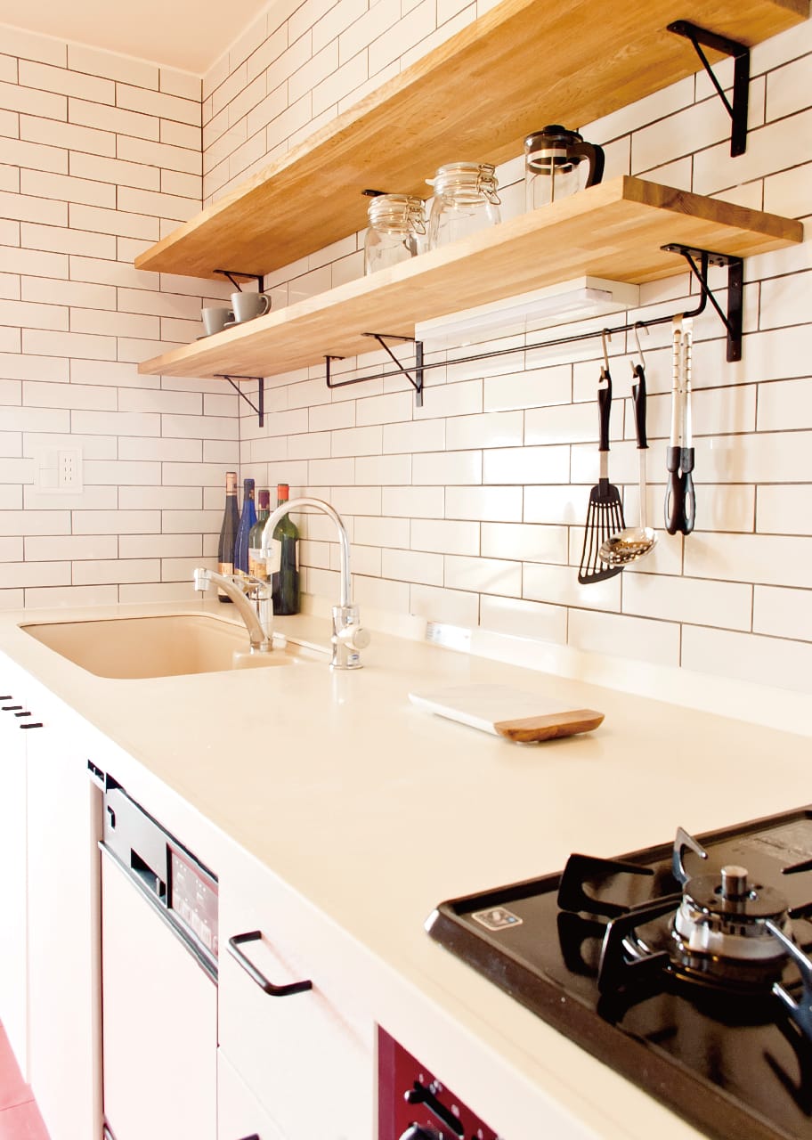 システムキッチンは元のまま扉を白く塗り替えて使用。