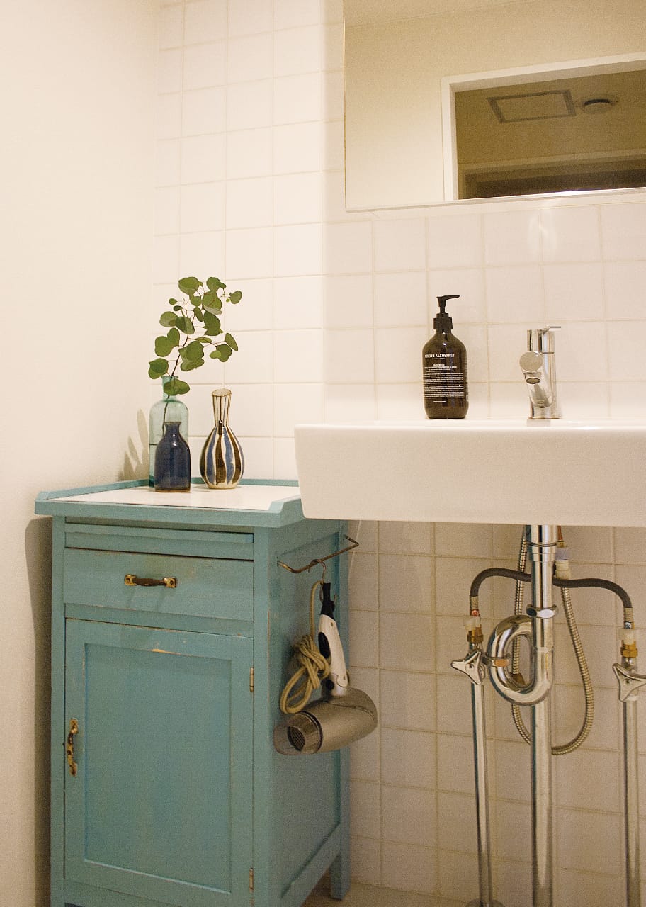 白タイルが印象的な洗面室。チェストは奥様が自らブルーに塗装。