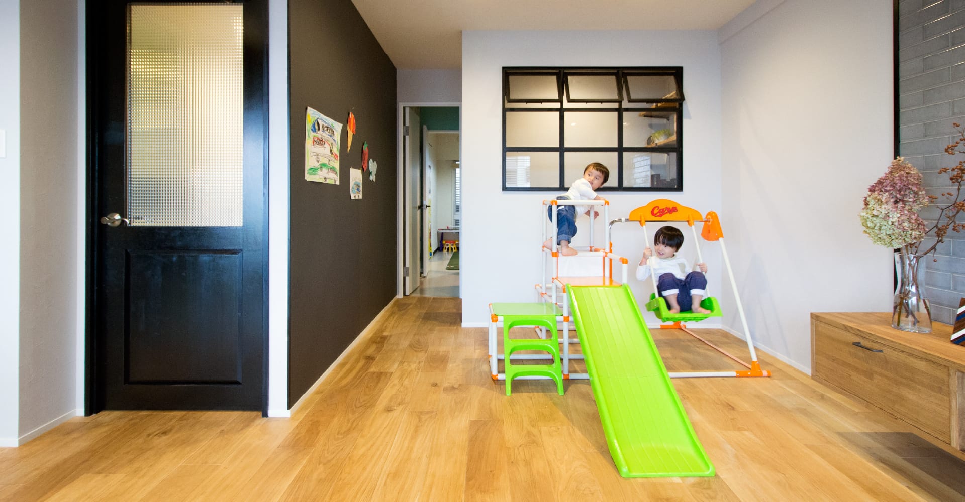 無垢フローリングの床をベースに、アイアンフレームの室内窓や黒板クロスの壁、