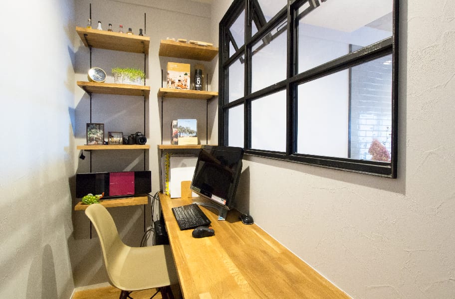 グレーの壁は黒板クロス。アイアンフレームの窓の奥は奥様のパソコンスペース。