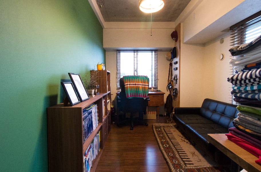 グリーンの壁が鮮やかなご主人の書斎。
