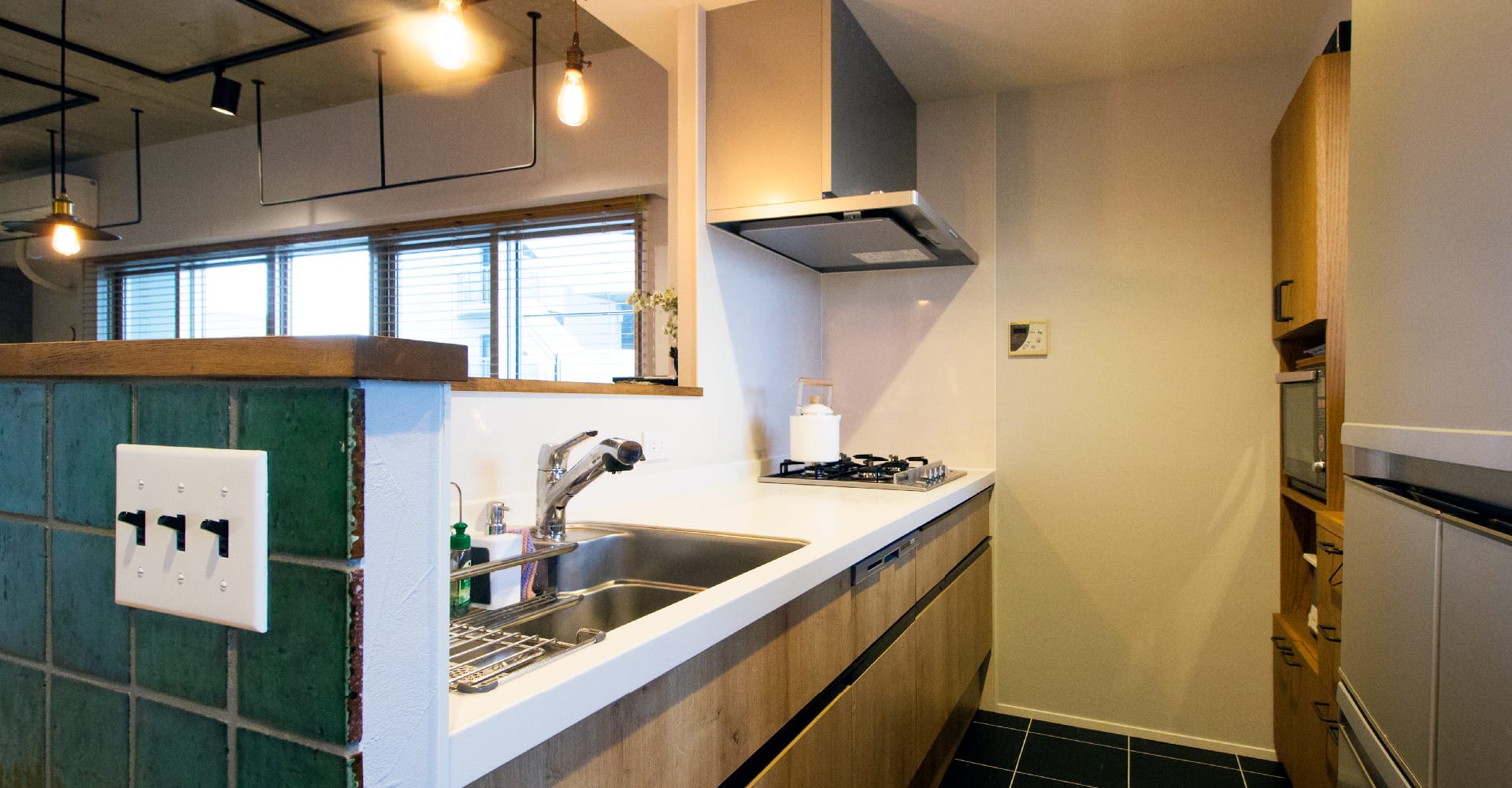 Kさんが目指したのは、家事がしやすく風通しがいい住まい。 キッチンから洗面スペースへ最短距離でアクセスできる家事動線を活かしながら、キッチン周りの機能性を再考。