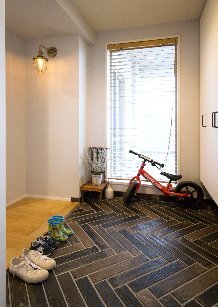 玄関の土間はタイルをヘリンボーンに。