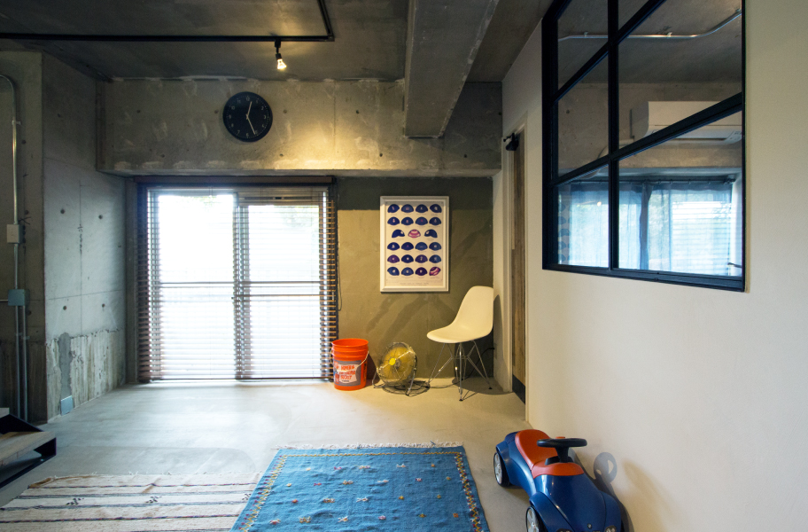 モルタルの床、コンクリート躯体の天井、壁の一部を左官塗りで仕上げ、配管やダクトをオープンに。海外製の大振りな家具やインテリアが馴染むインダストリアルな雰囲気とした。