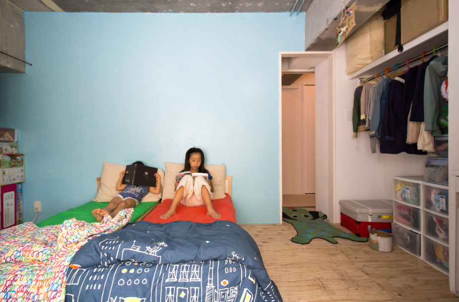 こちらは子ども部屋。ブルーの壁はDIYでペイントした。