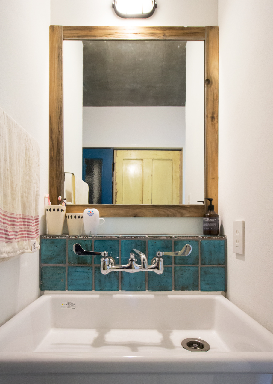 タイルと実験用のボウルを組み合わせた造作洗面化粧台。