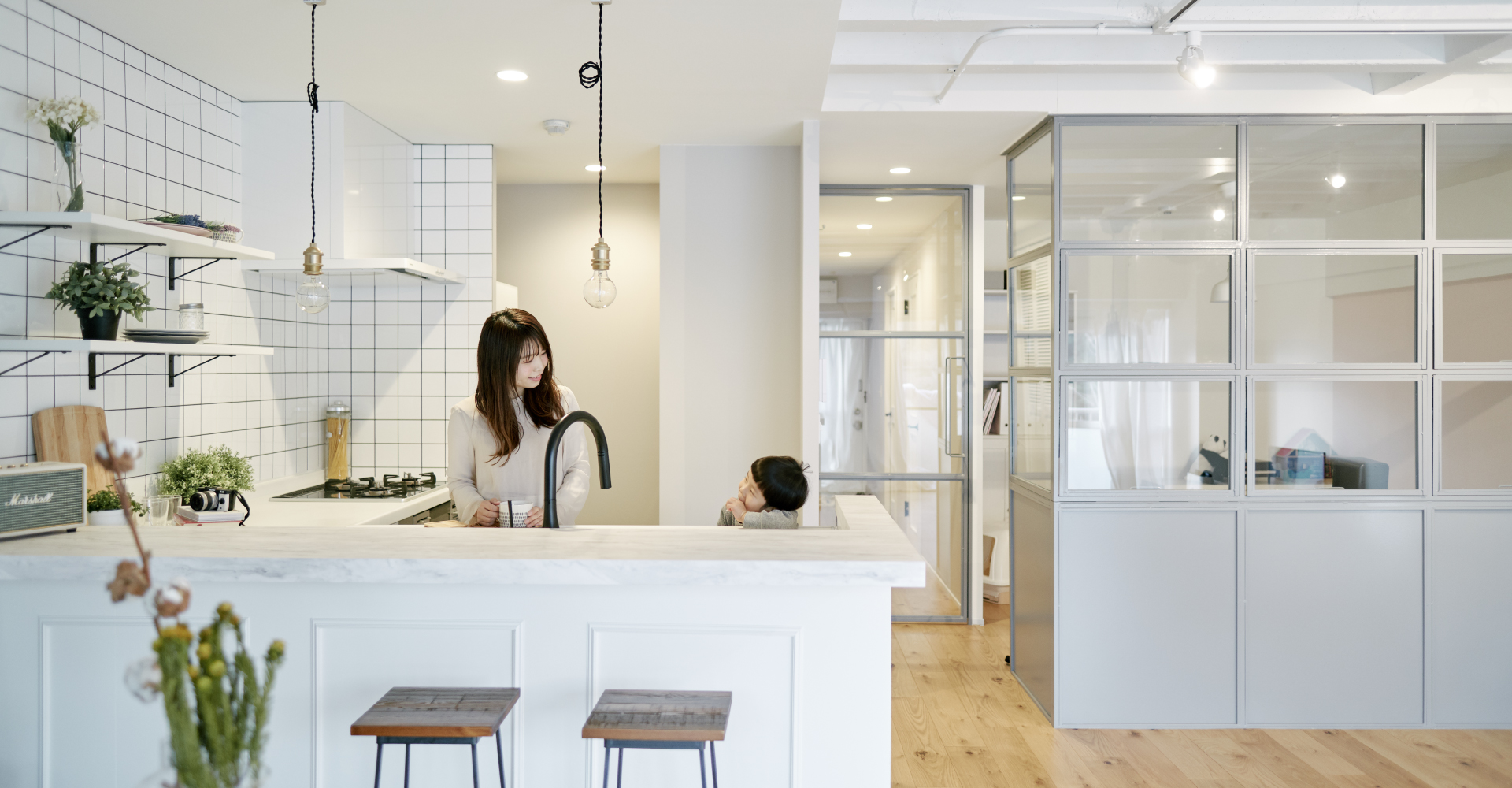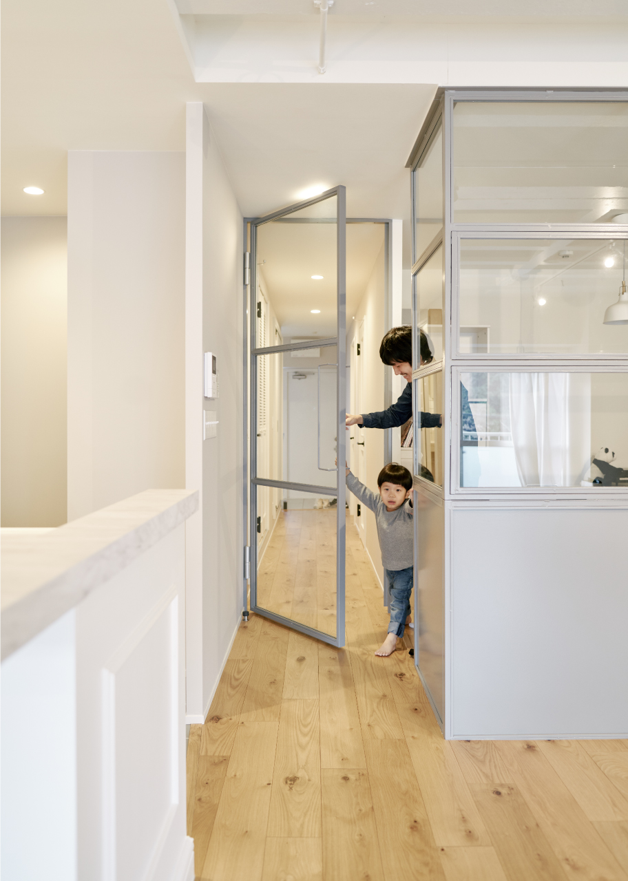 目指したのはパリのアパルトマンスタイル。LDK内には奥様のワークスペースも。「仕事をしながらでも子どもの様子がわかるようにしたい」という要望に応え、プランしたのが窓が9つあるアイアンフレームのパーテーション。「最初は小さい窓がついていただけだったのですが、せっかくなのでとご提案いただいたのがこのプラン。ドアとデザインや色を合わせてもらって、空間全体が明るくなりました。LDKとの繋がりの感じますし、とても気に入っています」。