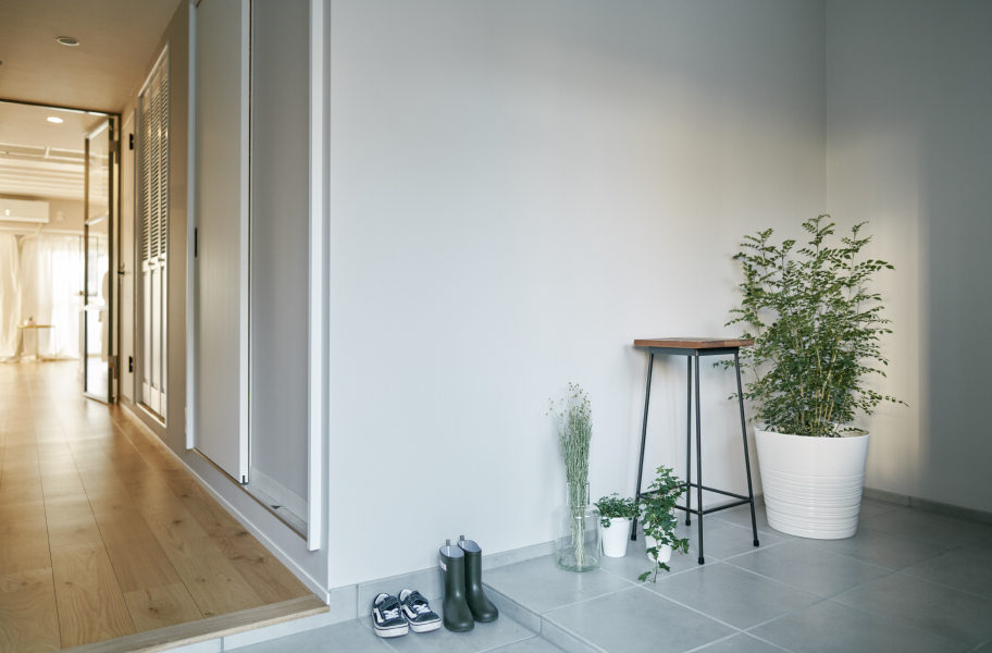 玄関を広げ、雑貨や植物をディスプレイ。