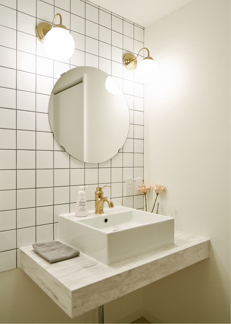 キッチンのイメージに合わせて洗面化粧台を造作。