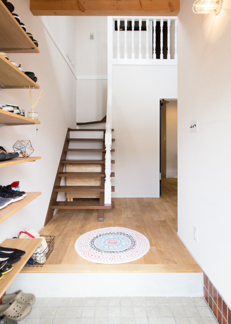明るく開放的な吹き抜けの玄関。階段の手すりを白に塗り替えてイメージを一新し、土間スペースにオープンなシューズボックスを造作した。