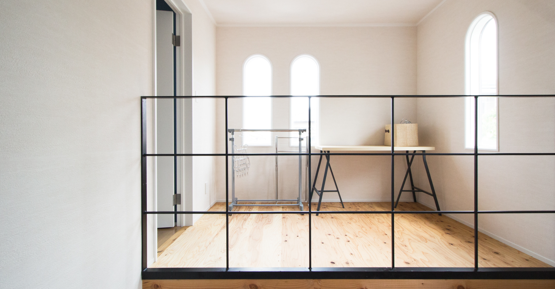 玄関の吹き抜けの一部に新設したロフトスペース。寝室から出入りできるようになっており、洗濯物を畳んだり、