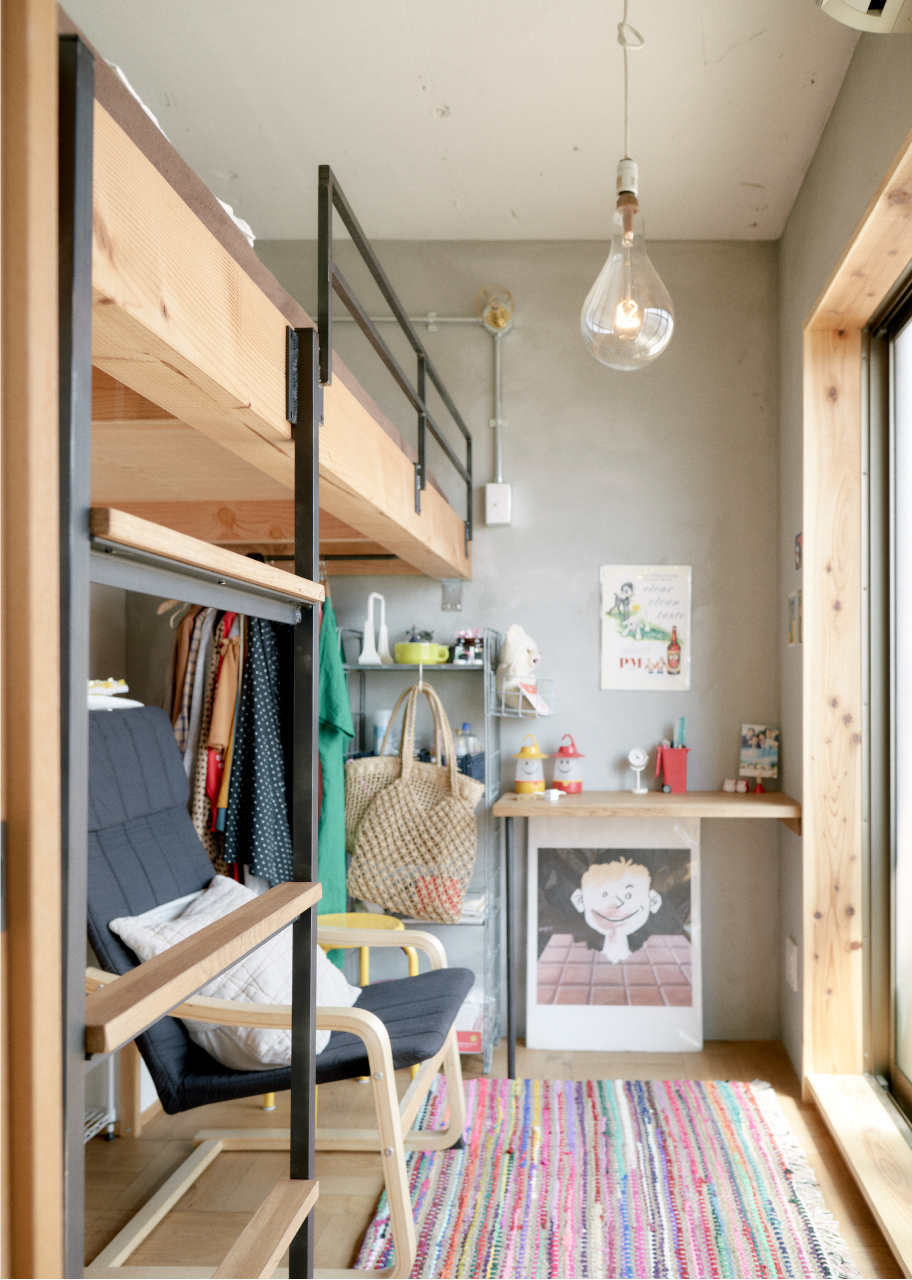 「北摂で生まれ育ったので、ずっとここに居るのが当たり前みたいに感じている」と語る豊中市のEさん家族が暮らすのは、中古マンションをリノベーションしたこだわりの詰まった空間。 こんな家にしたい!という明確な想いがあったEさん夫婦は新築や建売の家ではなくリノベーション一択だったそうだ。 旅好きで様々な場所を訪れたご主人が旅先で目にしてきたものに奥様の理想を重ねた。 お二人が目指したイメージは「ゲストハウス」。 海辺の街に佇む素敵なホテルや、海外のデザイン性の高いホテルなど、参考にしたというゲストハウスはEさんご夫婦の「いいもの」を目利きするセンスを感じるものばかり。 広めに設けたお店のような玄関土間に、各寝室に作りつけられた造作のベッド、モルタルの色にこだわったキッチンの腰壁周りには造作のカウンターテーブル。 Eさんが思い描いた「ゲストハウス」の要素と「家族の暮らし」が絶妙なバランスで溶け込んだ、居心地いい空間になっている。