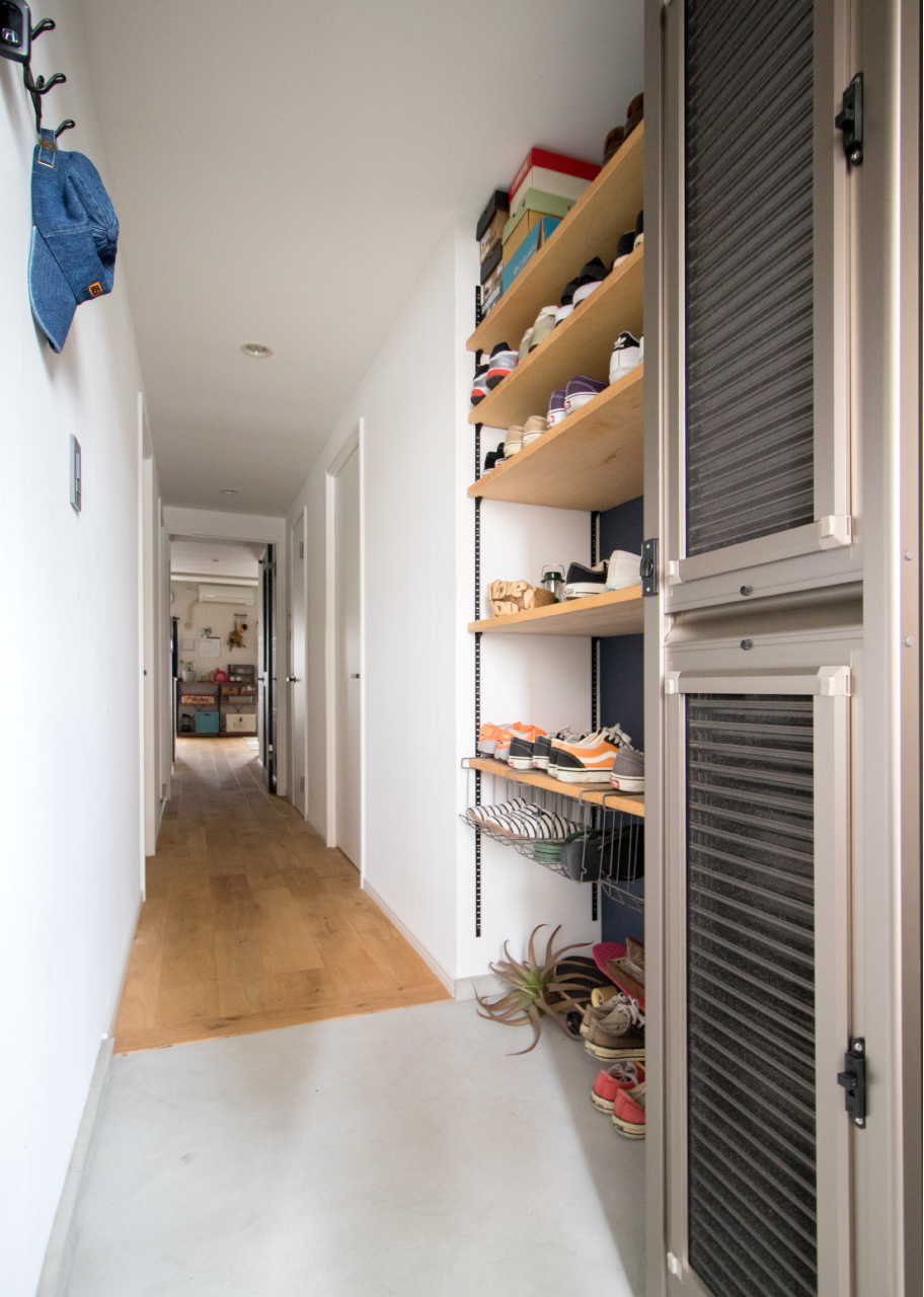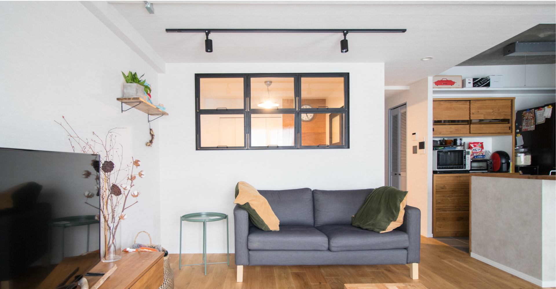 元々DIYが好きでクロスを貼るなどセルフリノベーションをしていたYさんが「どうせやるのなら、もっと」と以前ご友人がリノベーションをしていたStandardをパートナーに本格的なリノベーションをすることになった。「ヴィンテージとか、家具もかっこいい系が好きです」と言うYさんはインターネットやインスタグラムをフル活用しイメージを集めて、自分たちの理想を固めていった。“床を無垢材にする“、“天井を躯体現しにする“、など譲れないポイントを決めていき、中でも「これを絶対につけたかった」と、和室兼ワークスペースの壁についたアイアンの室内窓はお気に入り。LDKと廊下・玄関の部分リノべということで大きく間取りの変更は無いが、和室のサイズを少し変更しLDKを広げることで家具の配置などが変わり、以前よりも広く有効に使えているのだそう。「自分たちでできるDIYも限界があったので、やってよかったです」。ご自身の手で作り上げた心地いい空間が、今回のリノベーションで更に心地よく住み良い空間へとパワーアップした。