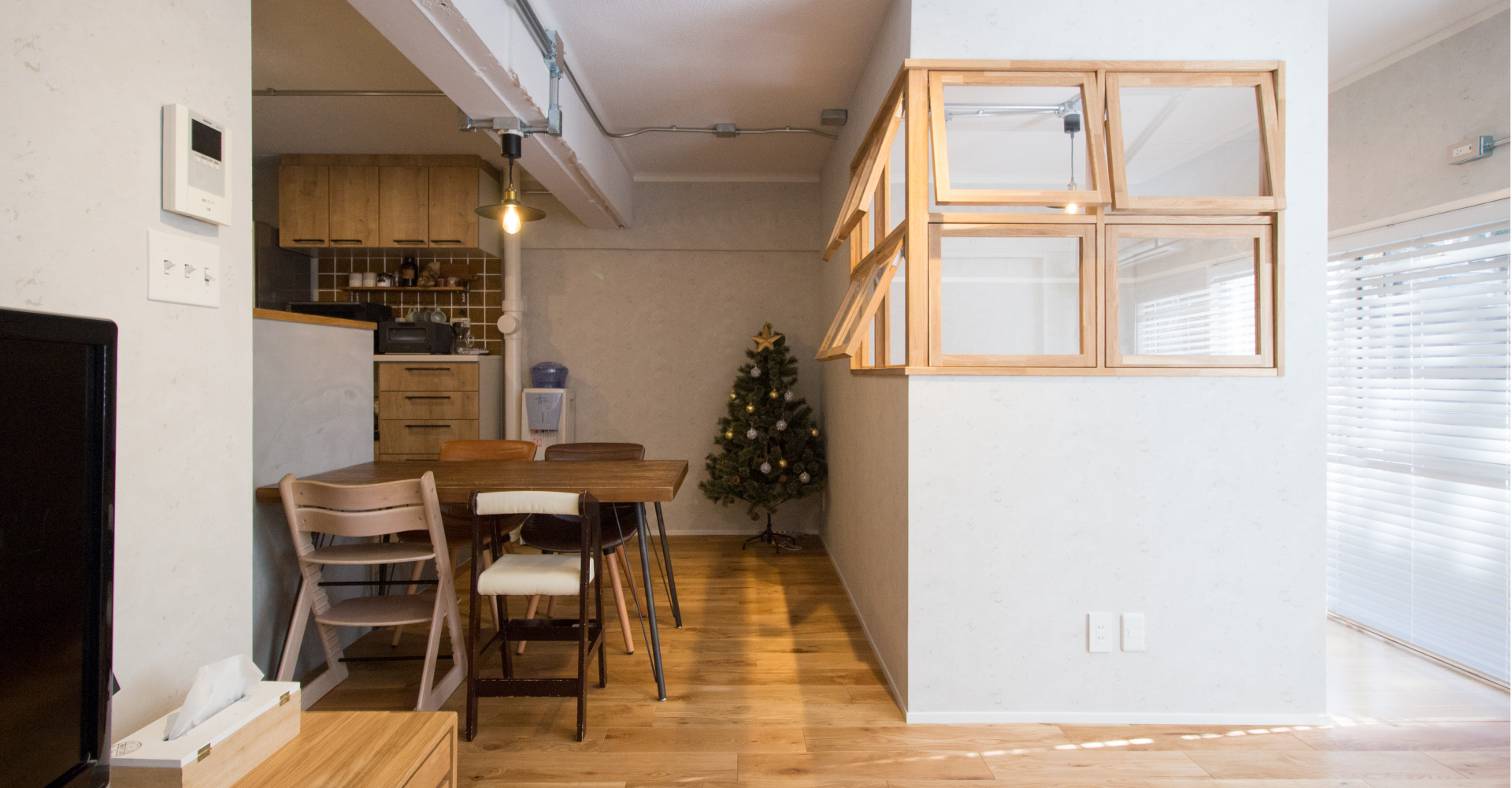 「絶対に木がよかったんです」とI様こだわりの室内窓が空間のアクセントとなっているLDK。
