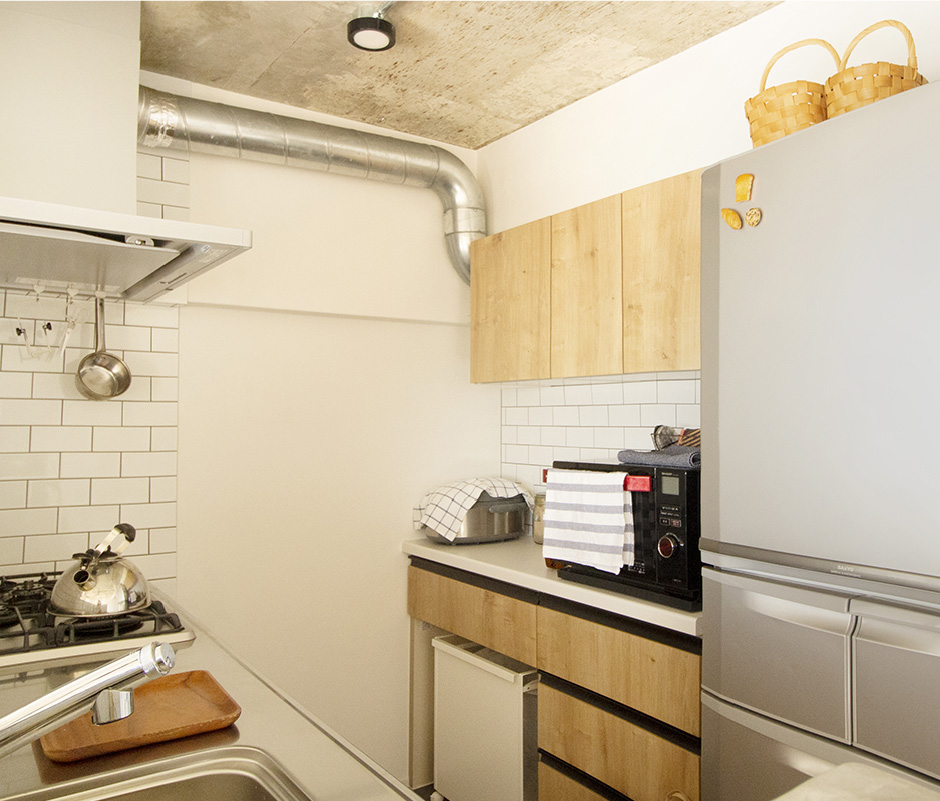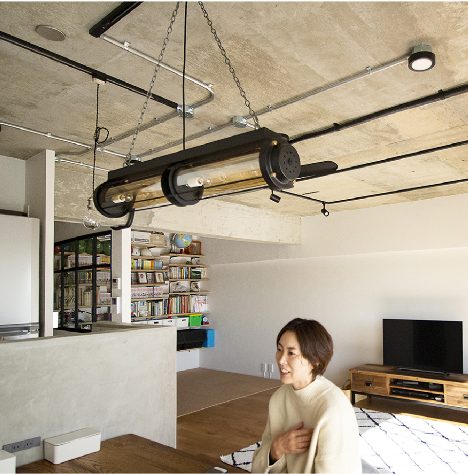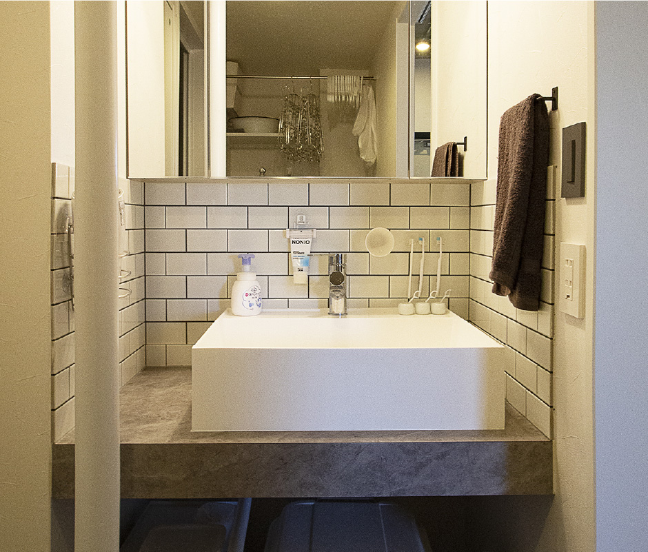 今回のプランニングのポイントは、インダストリアルやビンテージ感といった、男っぽいイメージをお好みのお客様に合わせて、天井の躯体現しやダクト現し、エアコンの配管をむき出しにして、あえて見せるデザインにしたところです。ほぼスケルトンからフルリノベーションしています。お酒を飲みながらお料理を楽しむという奥さんこだわりのキッチンは、居心地いい空間になるよう、タイルにもこだわりました。また、ご主人がこだわったというお風呂に合わせて、洗面のあたりを広めにとった事で、より使いやすい空間に仕上がったと思います。