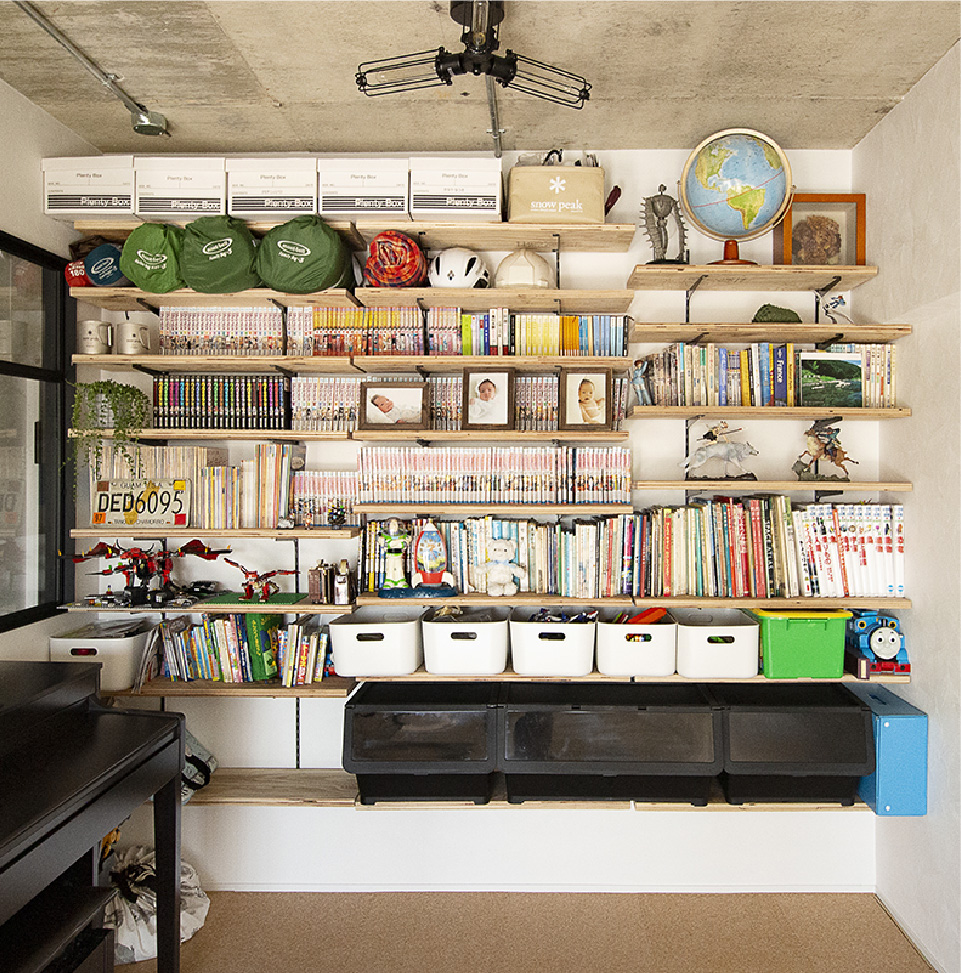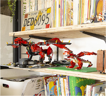 これは旦那の唯一のこだわりポイントなんです。家中の本が収納出来る部分と、子供達が作ったレゴのオモチャも崩さずに飾って置いてあげられるのが嬉しいです。収納が少なめの家なので、キャンプ用品なども見せつつ片付けられて部分良かったです。部屋の床に物を置きたくなかったので、この本棚にして掃除もしやすくなりました。