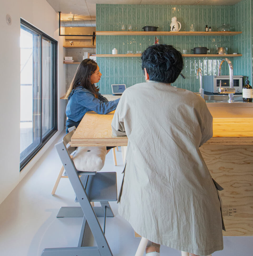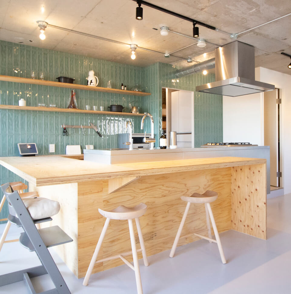 キッチンを家の中心に配置して、キッチン本体とダイニングテーブルを一体型にすることです。元々ソファに座ってくつろぐ時間より、ダイニングテーブルに座って家族とコミュニケーションをとる時間の方が多かったので、一層のことリビング単体の空間は無しにして、「キッチンリビング」みたいな空間の方が自分たちのライフスタイルには合っていると思いました。キッチンが家の中心にあること自体が「生活感のない家」というコンセプトにも合っているなと思ったので、一貫してこだわっていました。