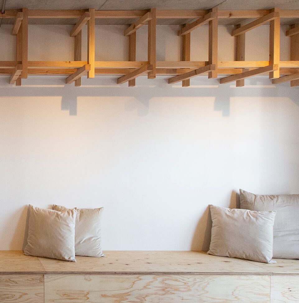ベンチ上の木格子の立体オブジェです。製作をお願いしたのはいいけれど、圧迫感が出て家が狭く感じるのではないかと完成するまで少し不安でした。実際に過ごしてみると全く圧迫感は無いですし、空間を引き締めるいい役割を果たしています。お願いして良かったと日々感じています。オブジェなので機能性はないですが、そういうものが家の中にあるのも自分達らしくおもしろさもあり、既製の住宅にはないリノベーションの醍醐味だと思います。