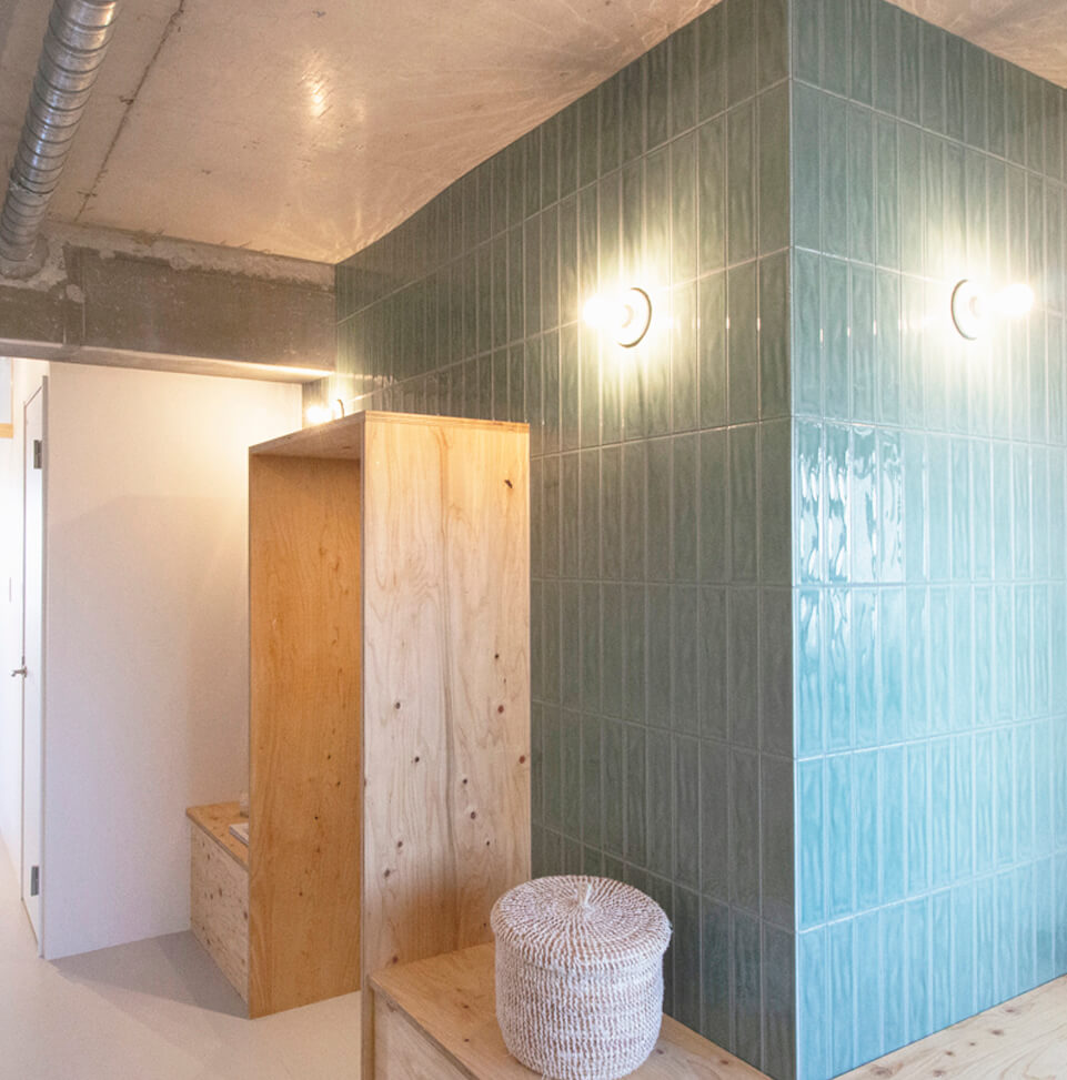 今回のプランニングのポイントは、お客様のご要望で生活感を出さないよう普通の間取りにはせず店舗イメージを意識し、壁際の天井に木格子の立体オブジェや規格外のベンチを並べて空間をダイナミックに魅せたところです。家に入ってすぐポイントになるよう、グリーンタイルを壁面に配置しました。奥様のご希望で洗面を広く使えるよう洗濯機を同じスペースに置かず使いやすさを考えた動線にしました。収納の扉ミラーや子供部屋の窓に枠をつけず出来るだけフラットに仕上げ、木の下地材にもこだわり通常は表に出ない仕様をあえて使いました。洗面とエントランスに設置した手の洗浄ボトルは薄い板に挟む仕様にするなど全体的に洗練された空間に仕上がったと思います。