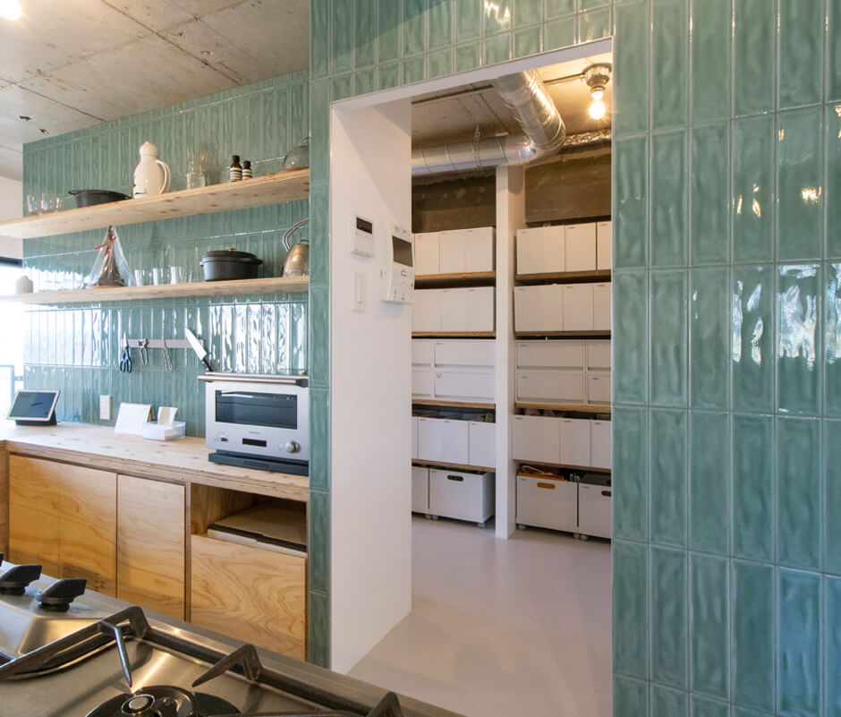 エントランス・キッチン・洗面台のグリーンタイルです。店舗の施工事例からインスピレーションを受けたグリーンタイルですが、各所に同色同型を貼ることで統一感を出してお店っぽい雰囲気を出したいと思っていました。身内や友人から「お店みたい!」とか「明るくて清潔感がある」と言って頂けることが多いので狙い通りの仕上がりになったと感じています。