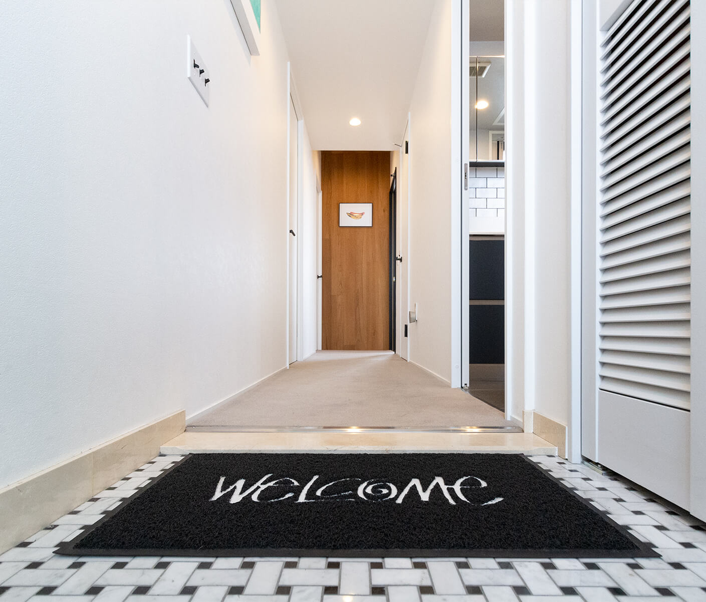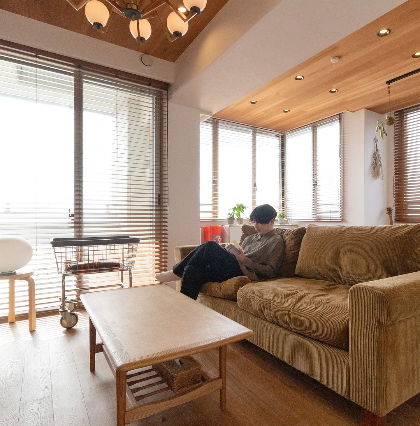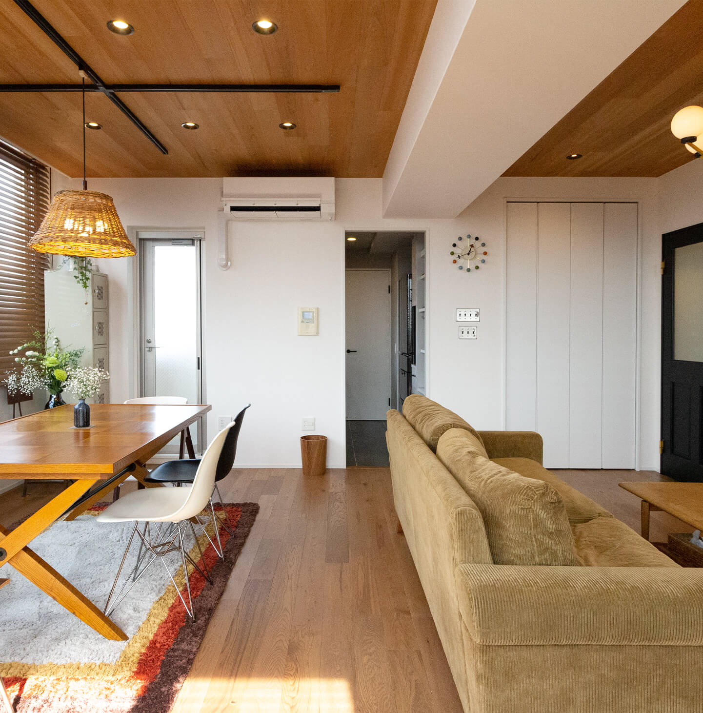 アメリカンミッドセンチュリーをテーマに、居住空間とインテリアがマッチする遊び心溢れる空間に仕上がりました。デザイン性が高く機能性も兼ね備えた、ホテルライクな雰囲気です。デザイナーズ家具が入るので、インテリアの映える空間づくりを意識しました。木材や、石タイル、カーペットなど様々なテクスチャを使い、自由でアレンジが効く空間になっています。エントランスから各部屋の細部までこだわり持たせ、エアコンも収納するなど見た目も美しく。ミーティングではT様と波長が合う感じで、お互い様々なアイデアをだしながら楽しい時間を過ごせました。