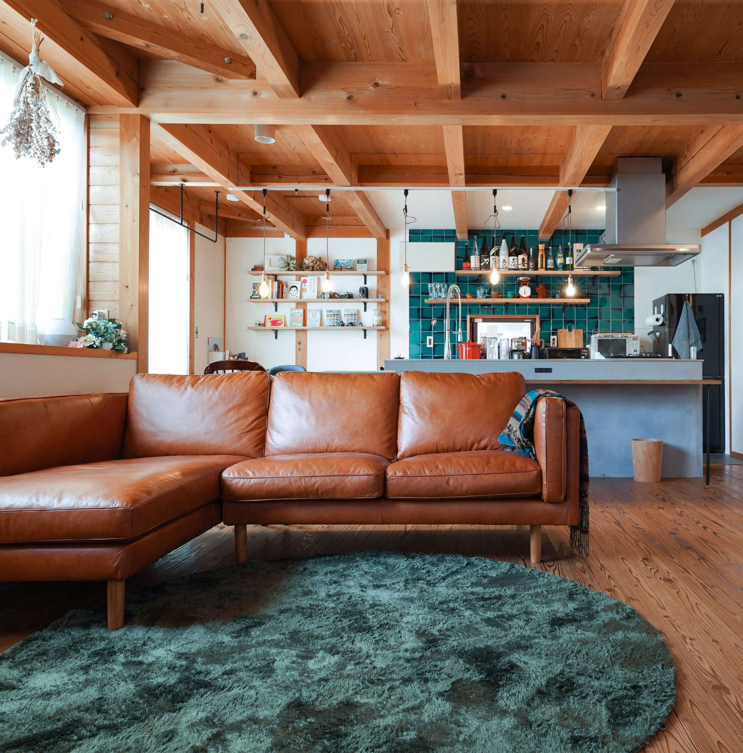 レザーのカウチソファです。使い込むほどに愛着と味が出る本革のものに決めました。大きいソファにしてよかったです。また照明にもこだわり、一階の客間と二階の寝室は後藤照明を選びました。懐かしく、それでいて新しいデザイン、やさしい灯りがとても落ち着きます。