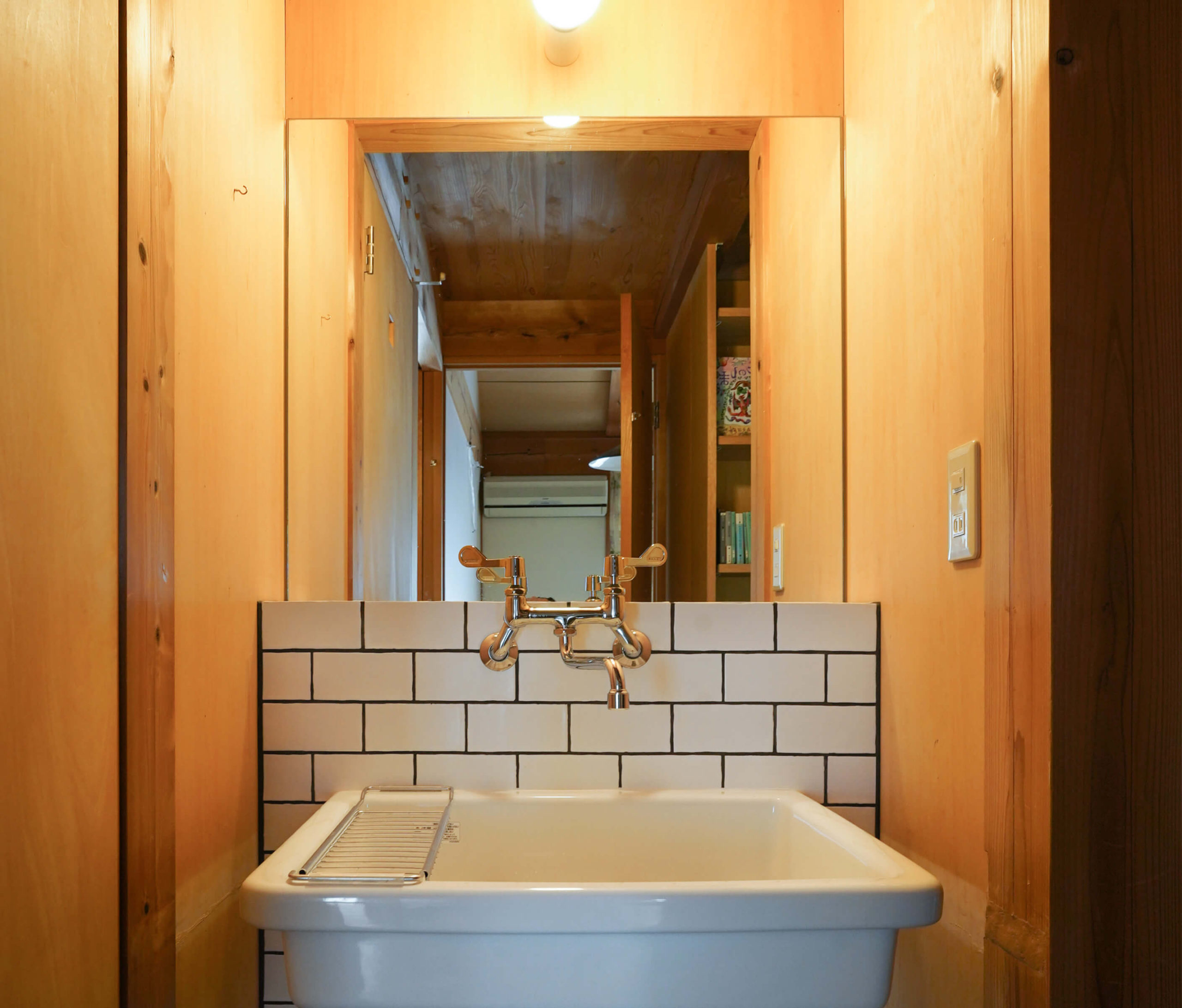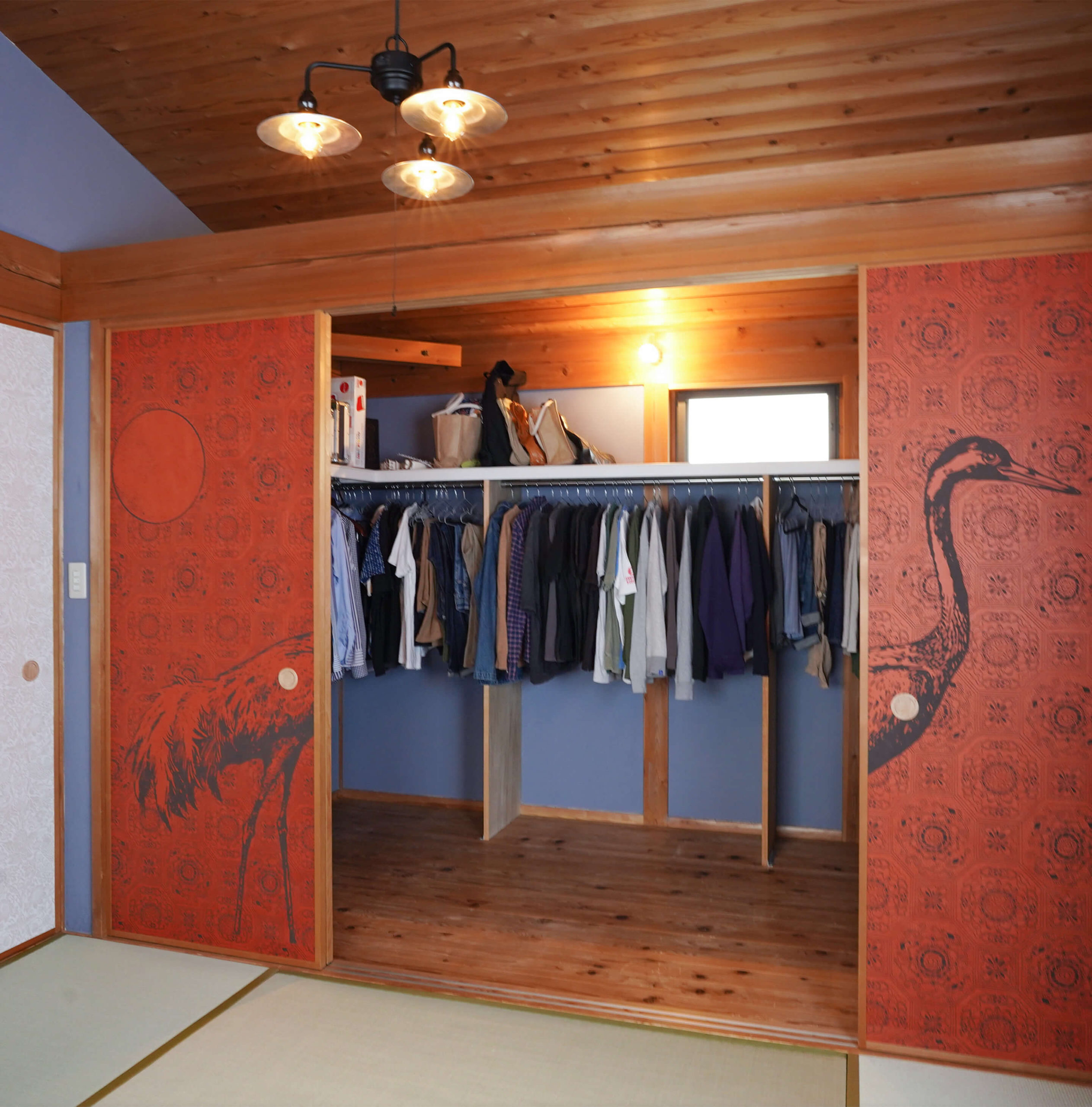 2Fのウォークインクローゼットです。4畳ほどの広さがあり、服は全て掛けて収納。襖で大きく開くので出し入れもしやすく、気に入ってます。また元からあった2Fの手洗い場も残すか迷ったのですが、リノベしてもらいペットや子供の物を洗えたりと思った以上に使い勝手がよく残してもらって良かったなと思います。