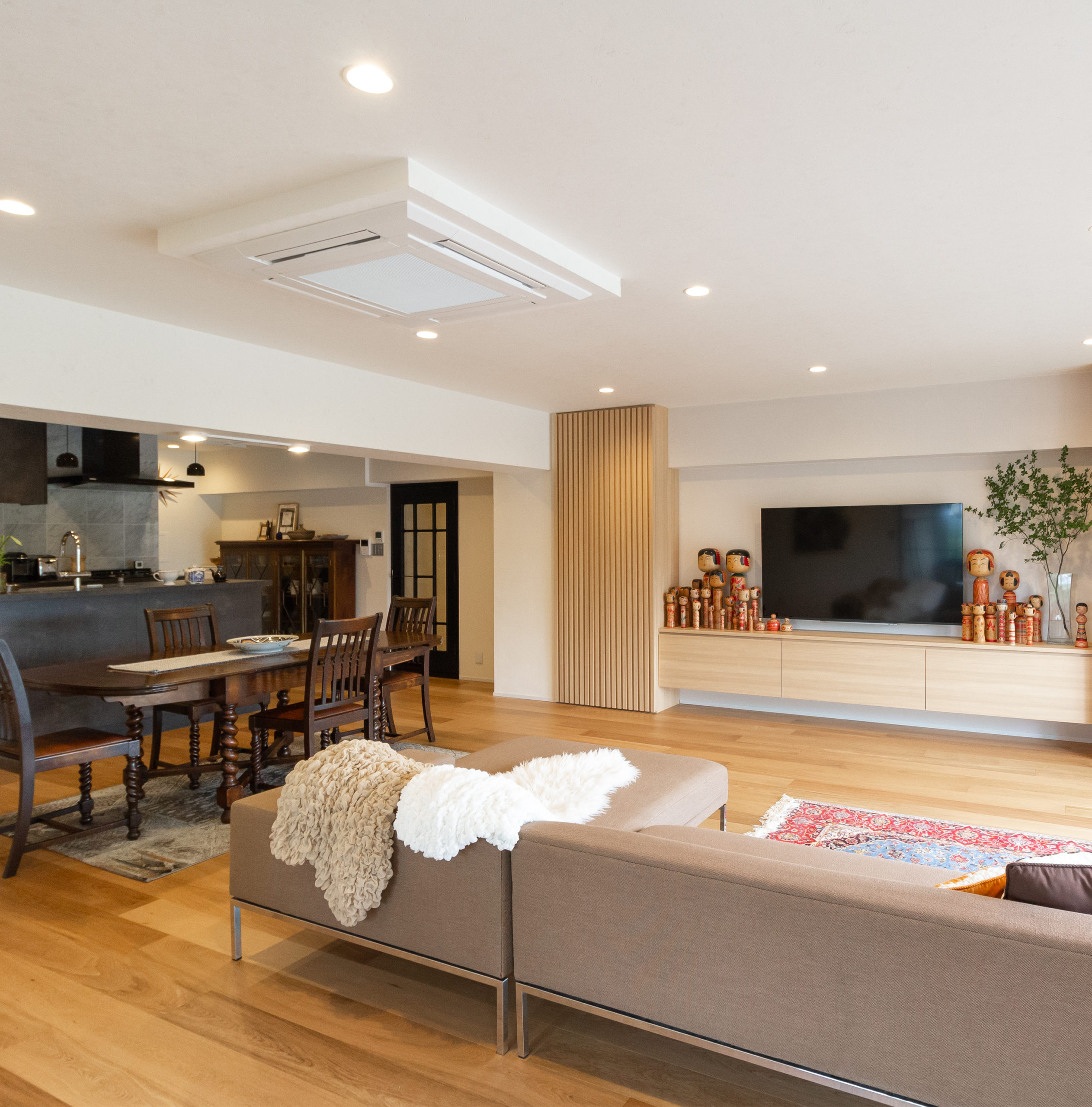 リビングのソファは家族みんなで座れるビッグサイズのものを選びました。探していたペルシャ絨毯は一目惚れして購入したものです。アクセントにもなり空間を引き締めてくれます。アンティークの水屋はコレクションの食器を飾りたくて、日本のものとイギリスのものが調和し空間にもマッチするものを選びました。