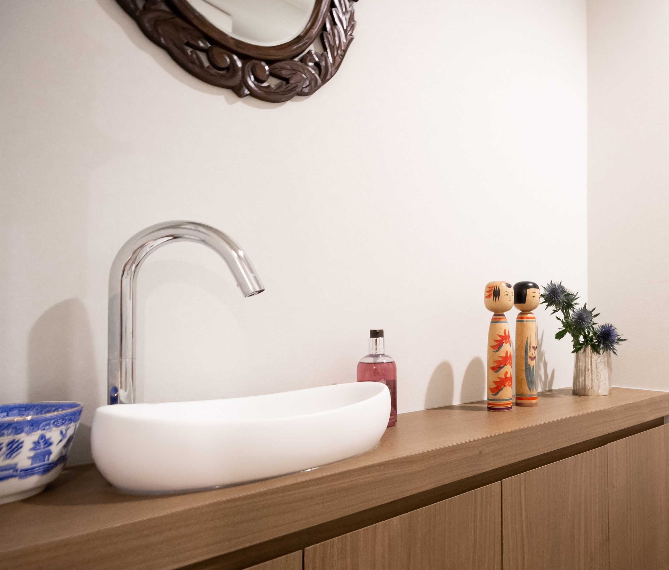 家族が毎日使う場所、また女性の多い家族なので洗面所はできるだけ広く、そして素材、色味、バランス、ディティールにまでこだわりました。楽しんで身支度してもらえる様やや贅沢な雰囲気に。あとはリモートワークということもあり、仕事に集中できる個室の書斎が欲しくて。平日は長い時間を過ごす部屋なので居心地の良さにこだわりました。