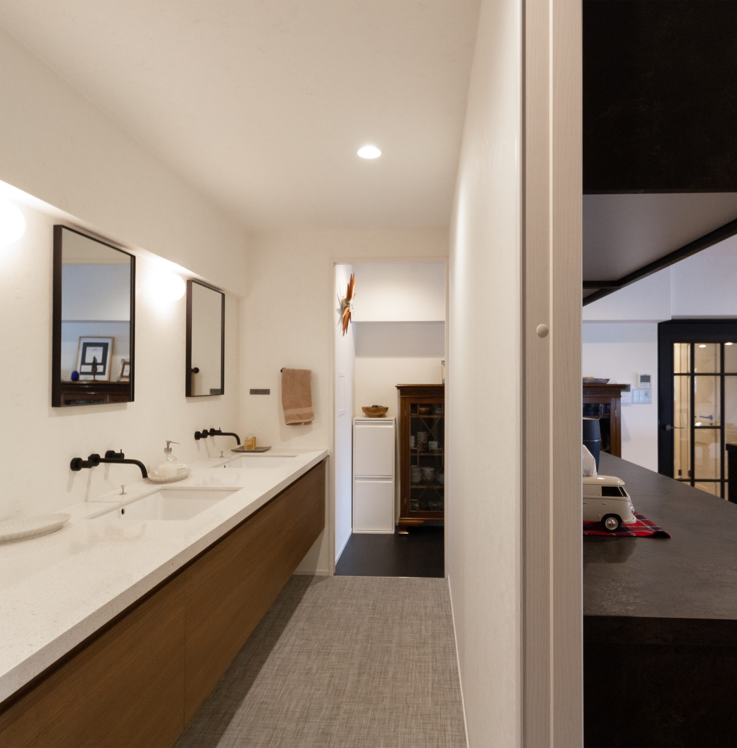 物件探しからStandardで手伝わせていただき、売買契約など対面必須な手続き以外の打ち合わせはすべてリモートで対応させていただきました。不安やご心配もあったかと思いますが、コミニュケーション取りながら空間と一緒に信頼関係も築けていけたと思います。今回のリノベーションのポイントはなんと言っても洗面ルーム。キッチンの裏を通り抜けるような動線が特徴で、広さとディテールにこだわりました。リビングのルーパー扉の収納はシンプルながらもデザイン性が高く、空間やS様のコレクションとも上手く調和したのでよかったです。ご主人こだわりのワークスペースは、快適さと開放感を意識し室内窓を取り付けました。ご家族揃ってお家で過ごされる時間が長いので、それぞれが居心地の良さを感じられる空間へ仕上げました。