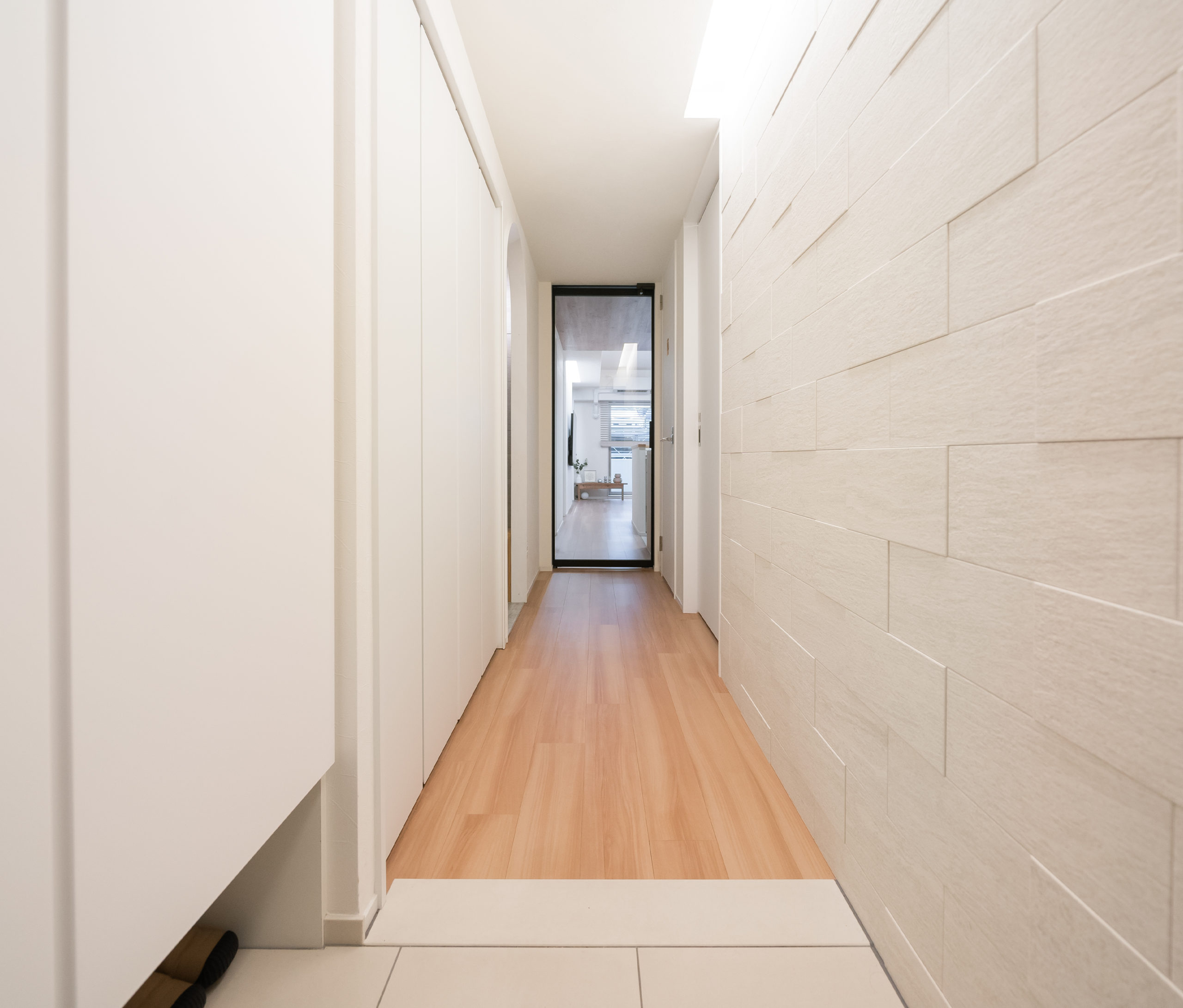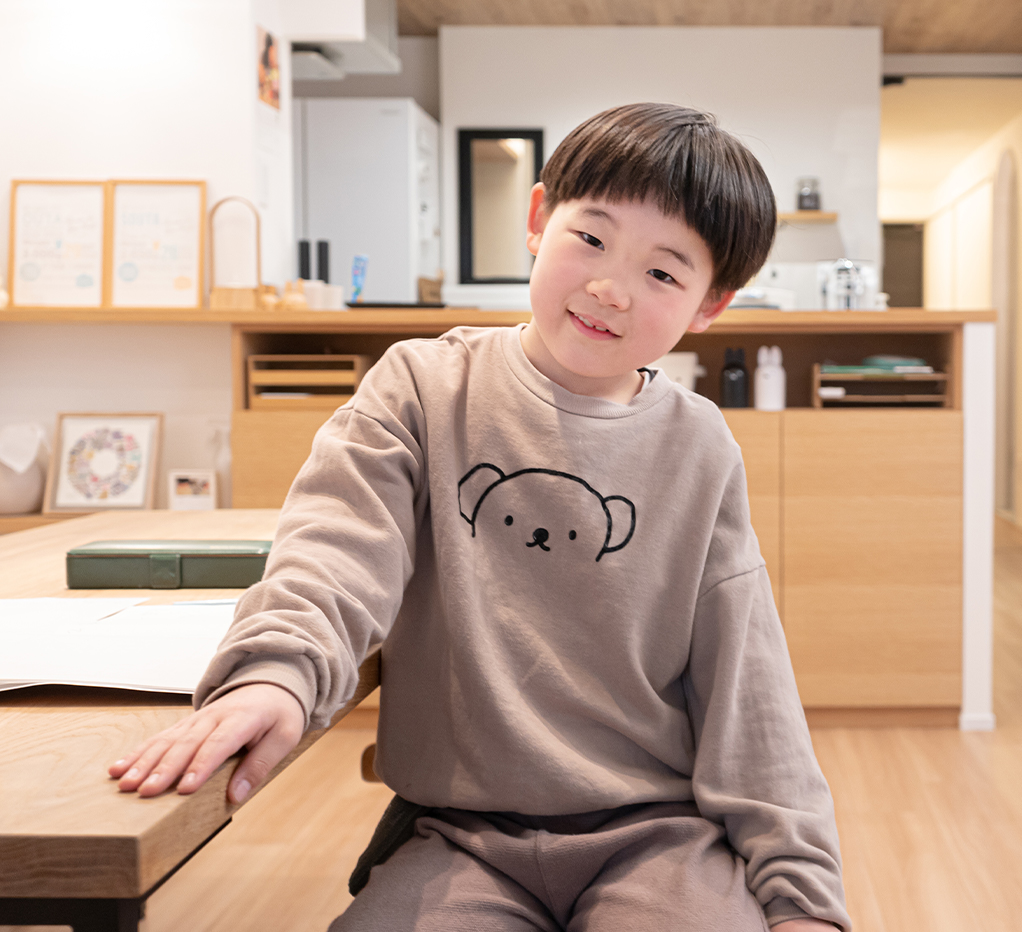 狭いマンションを少しでも広く見せるためにリビングは白を基調とし、広がりを感じさせるように、照明を上向きに設置しました。また、大容量のファミリークローゼット収納や、配線を極力見えないようにした壁掛けのテレビなど、細部にまでこだわりました。
