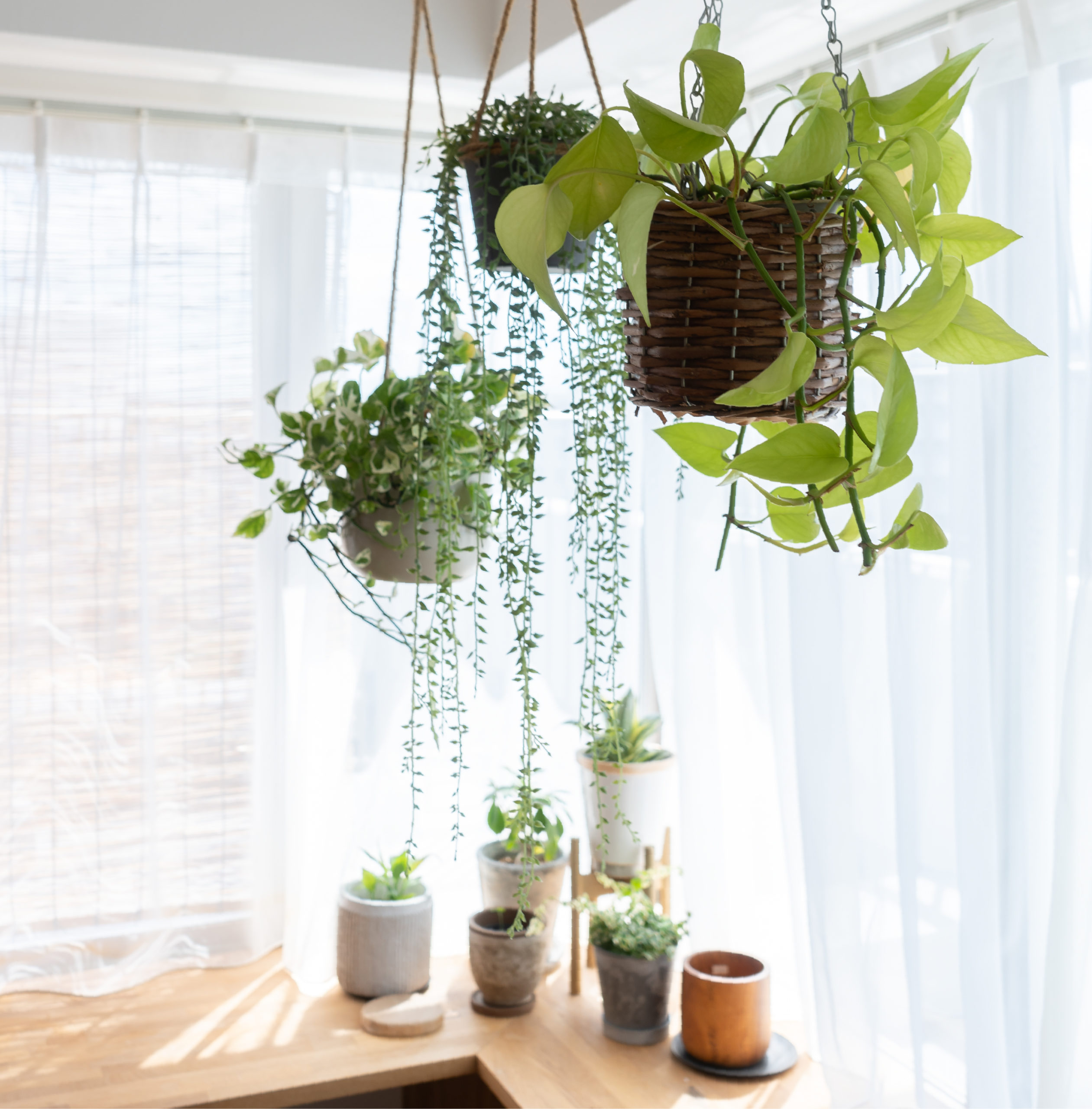 植物をたくさん置きたかったので植物を購入しました。夫の好みは南国を感じる観葉植物で、私の好みは吊るすタイプの植物です。2人それぞれの好みの植物が合わさって、少しずつ増えている最中です。