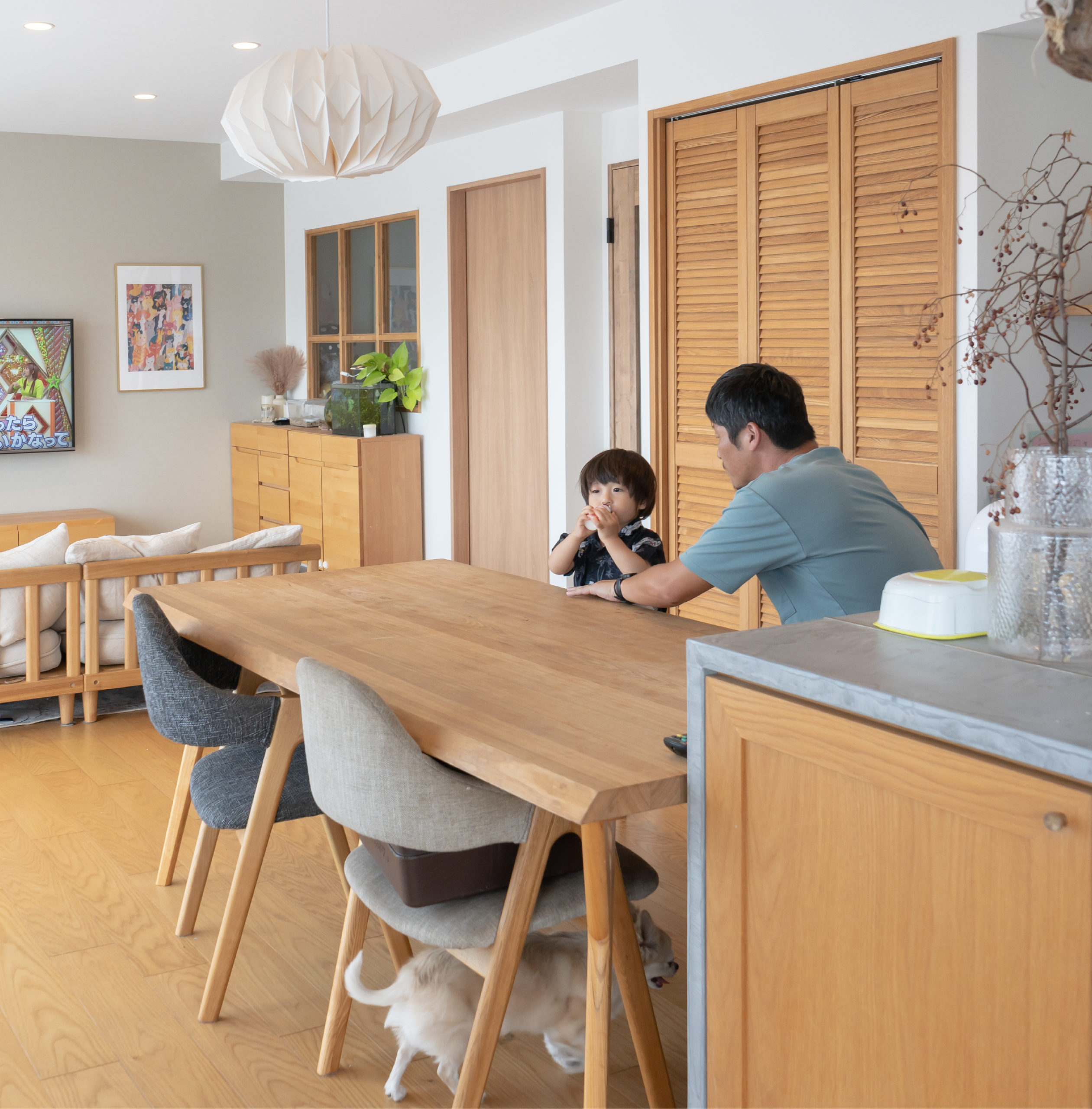 ヒアリング中に話させていただいた、引っ越し後に増える予定だったペットの犬やカメをご提案していただいたパースに、書き加えていただいた事が、入居後の暮らしや空間の雰囲気が掴めて、とても嬉しかったです。完成した家も、とても明るく過ごしやすい空間にしていただきました。キッチンにあった閉鎖的な壁をとっていただいた事で、バルコニーも含め回遊できるキッチンになりました。子供たちも回遊しながら、お手伝いをしてくれます。また、リビングの木製ドアはいつか子供たちと色を塗ってワンポイントにする予定です。本当にありがとうございました。