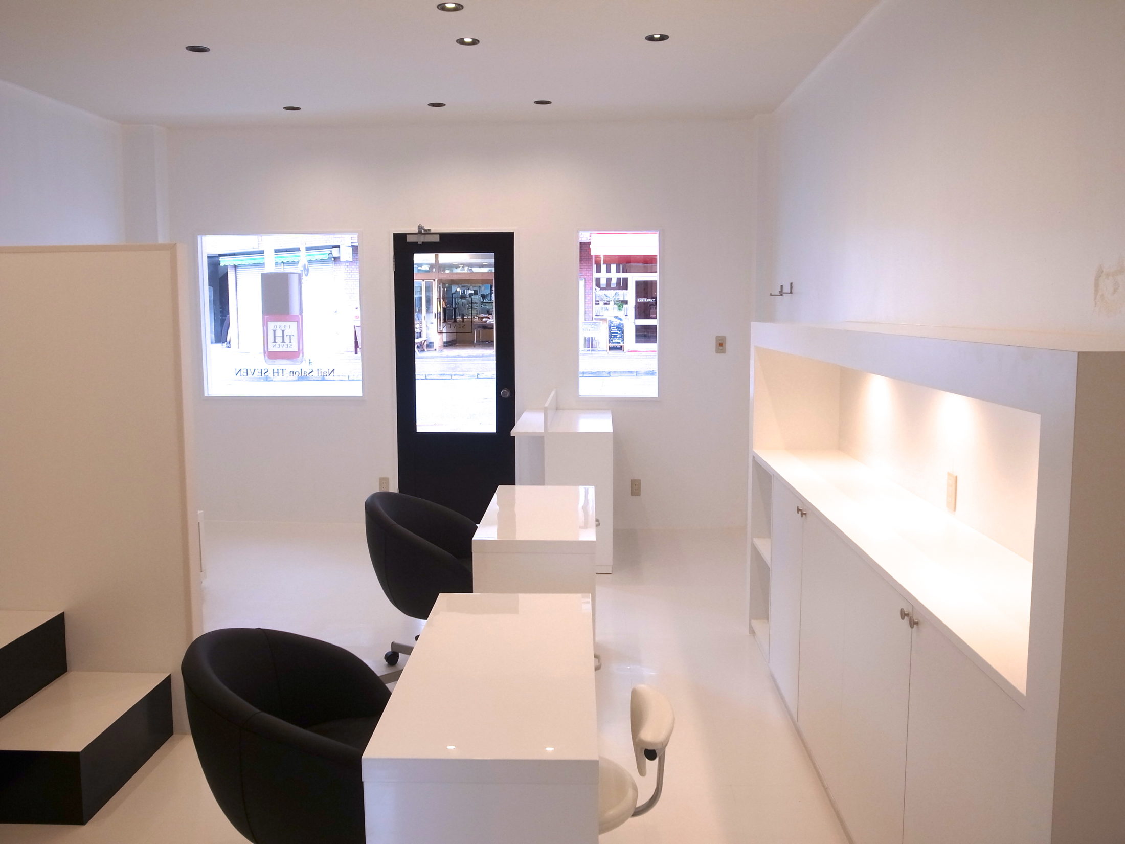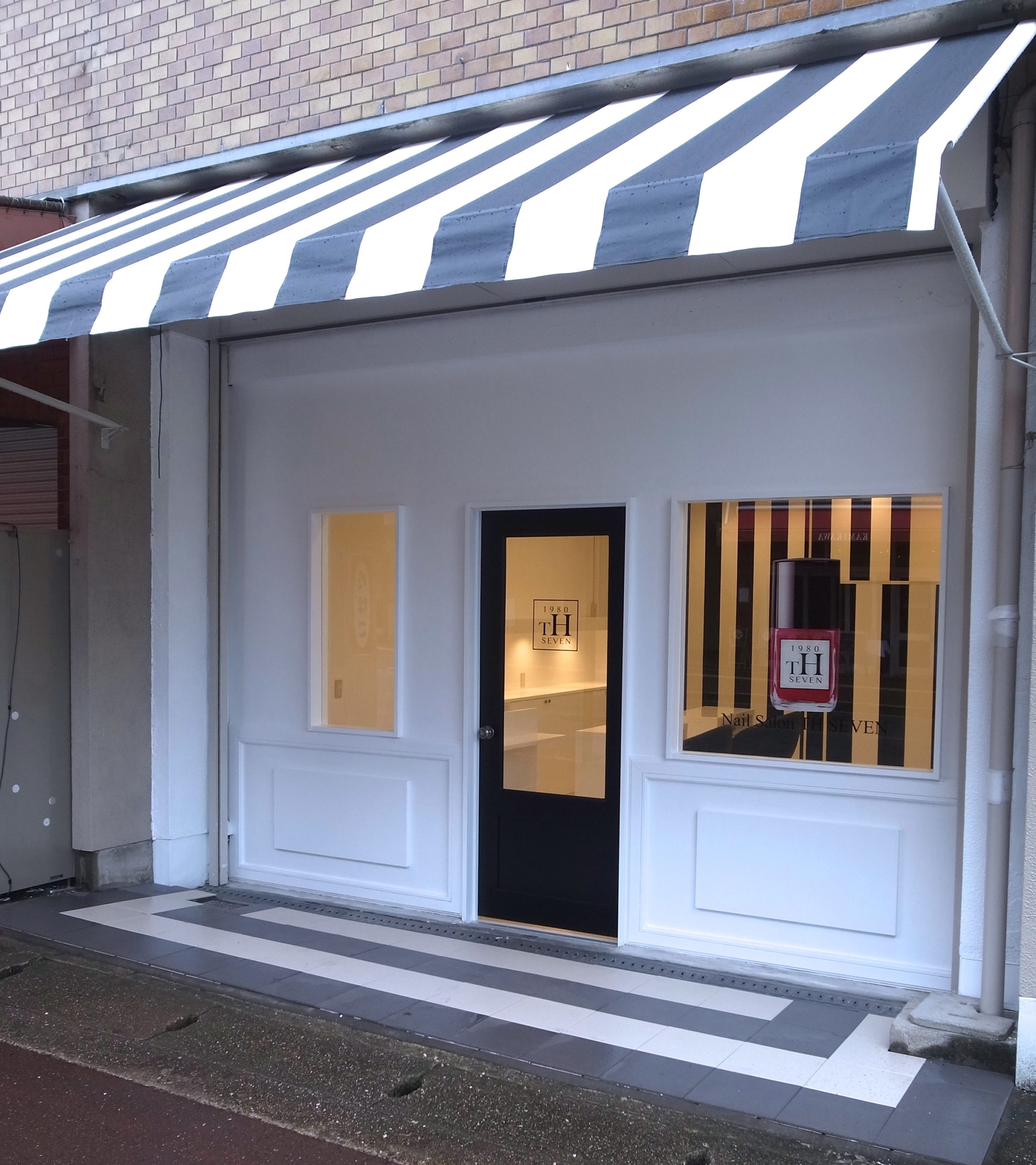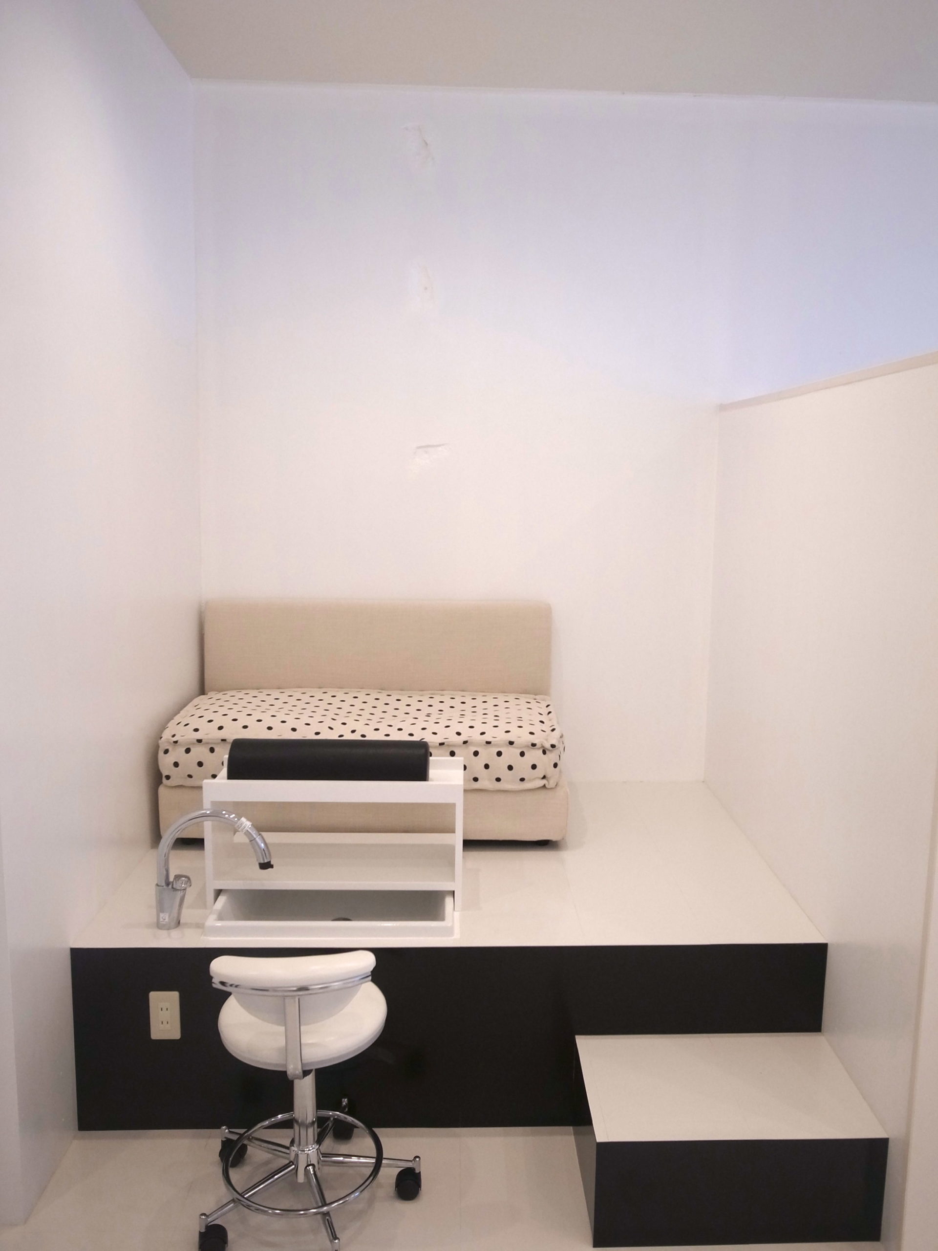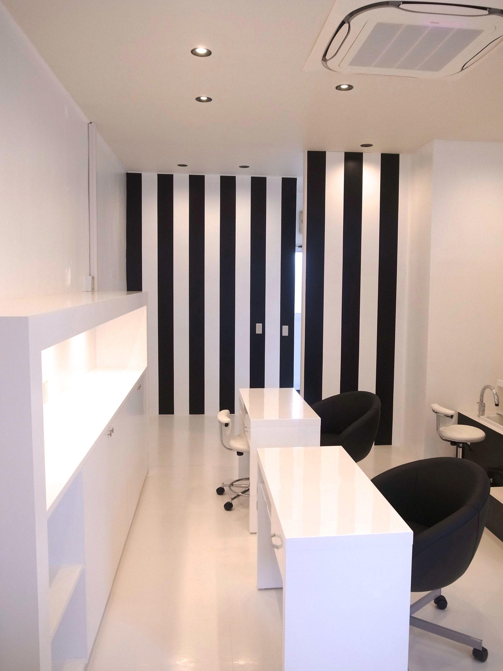 大阪府豊中市のネイルサロン『TH SEVEN』 白と黒を基調とした内装空間デザイン、 フットブースは居心地よい空間に。