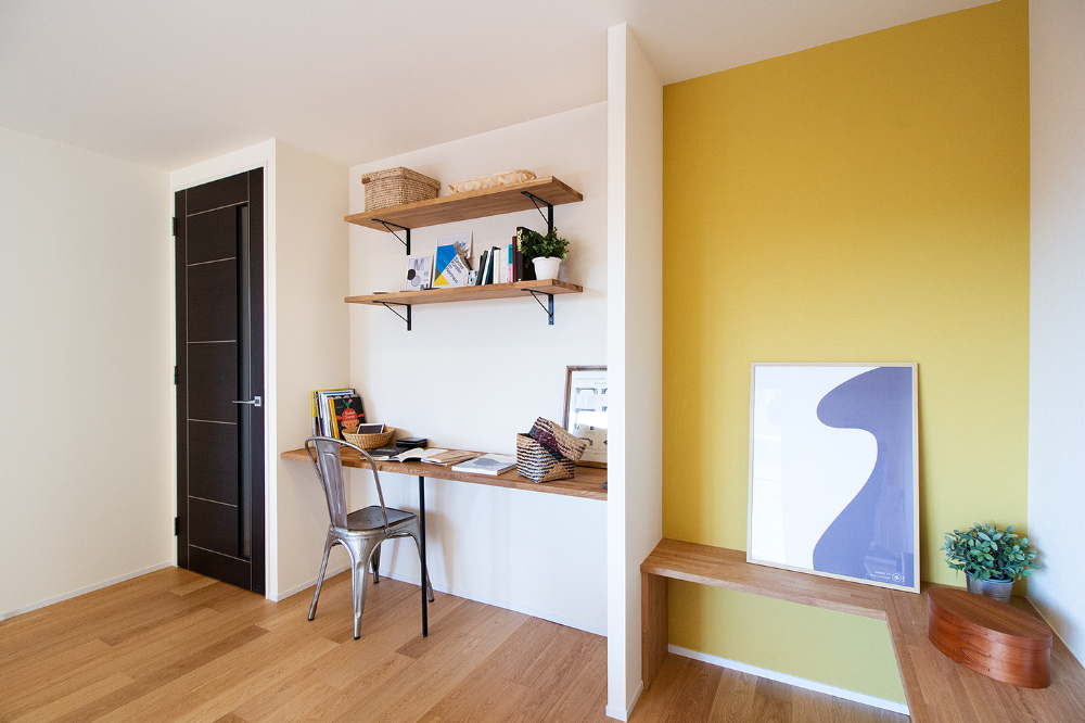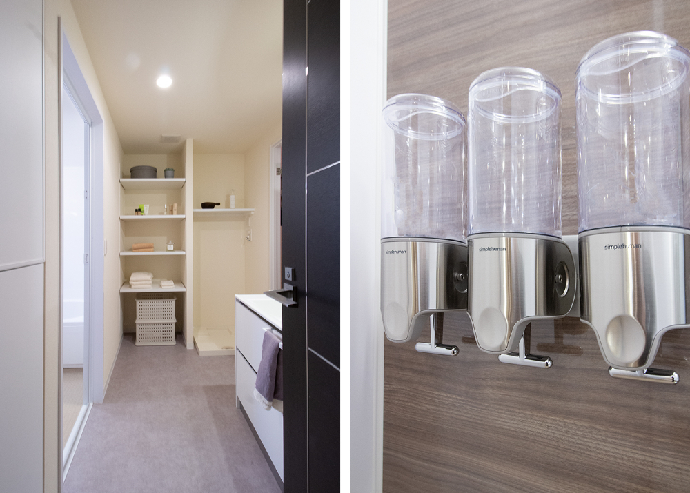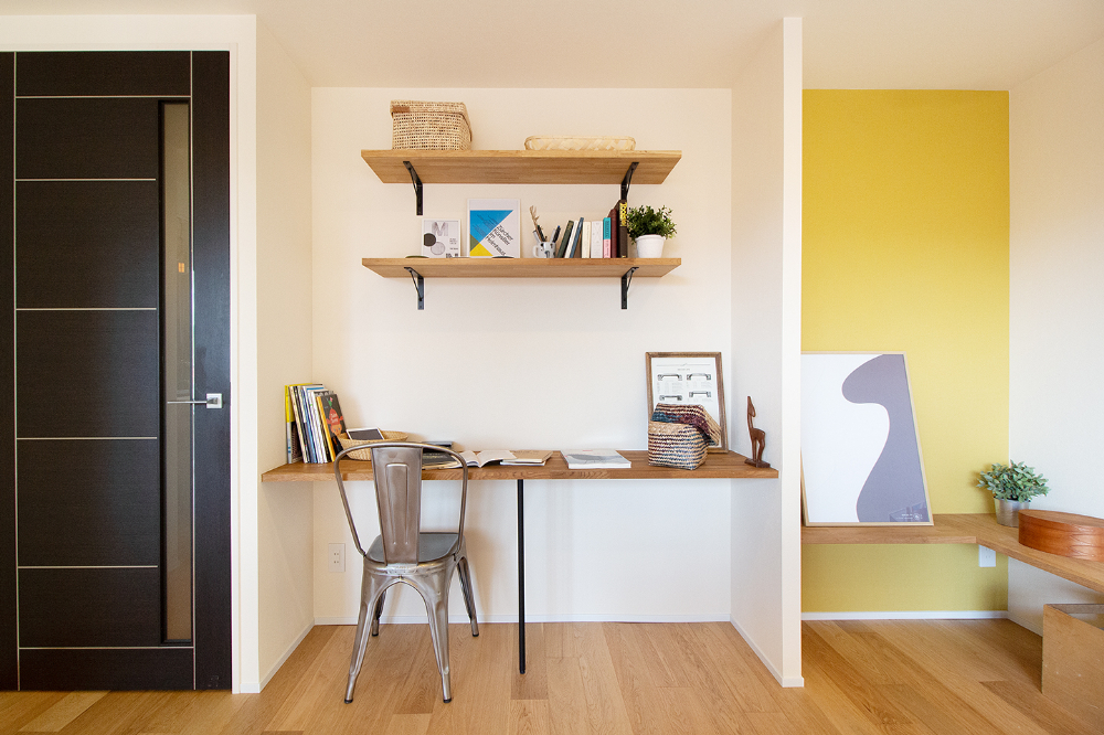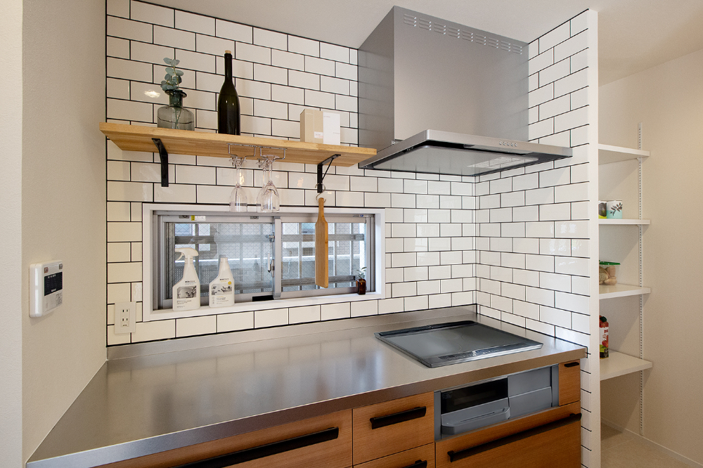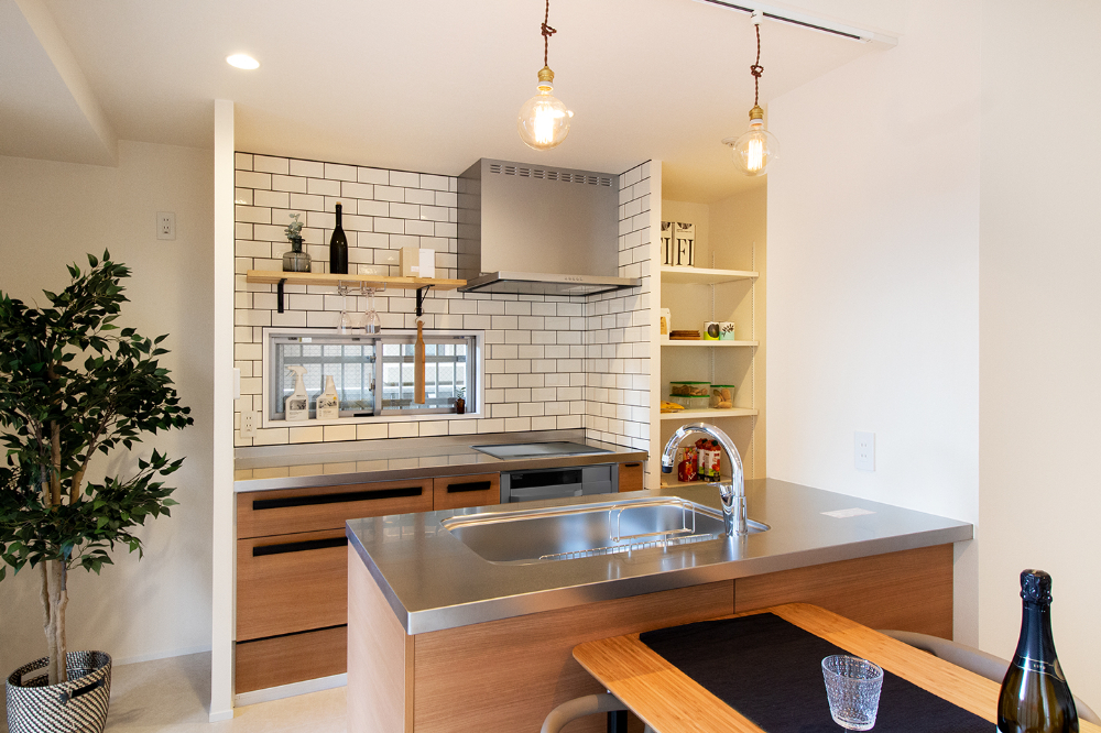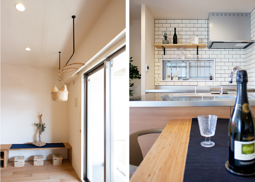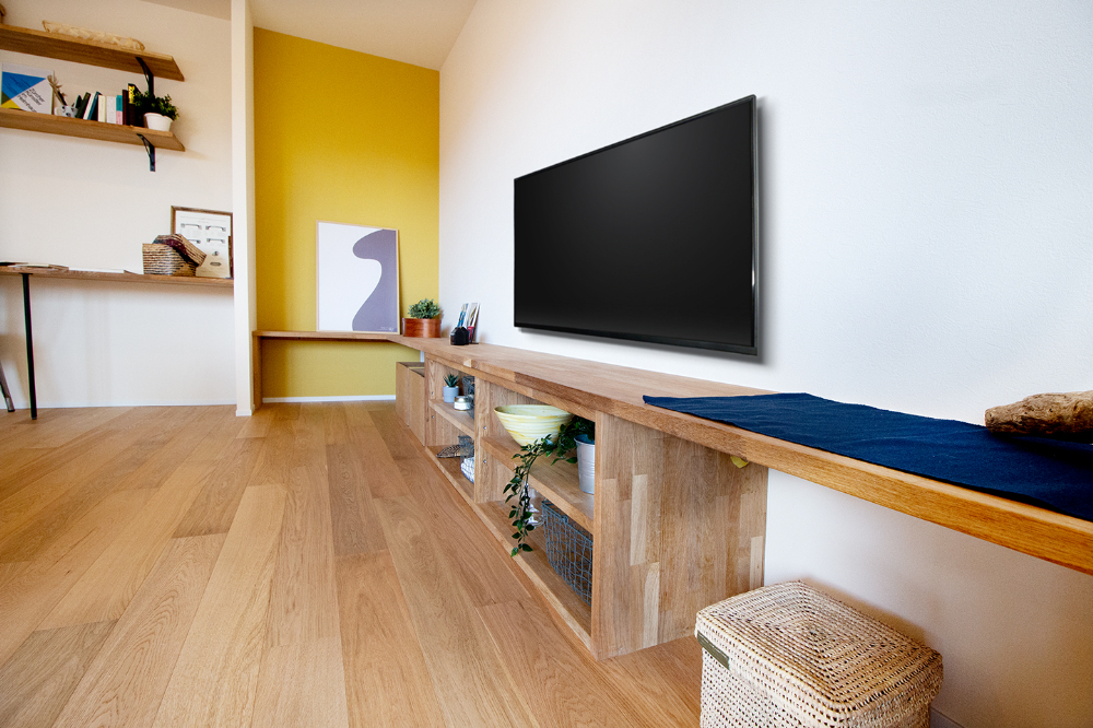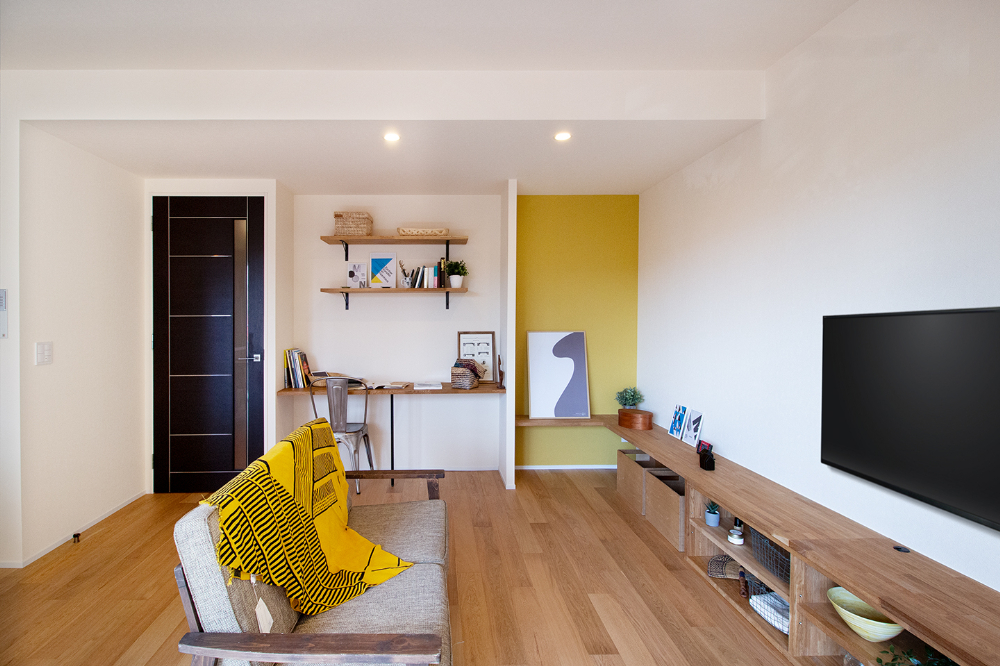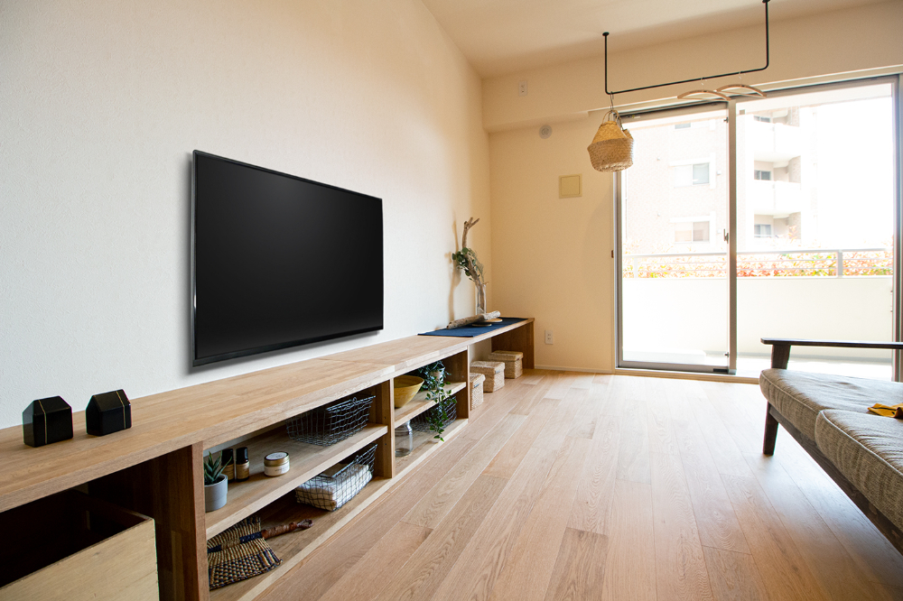 大阪府豊中市、築16年の中古マンションをリノベーション。LDKの壁に沿うように設置したテレビボードは、お手持ちの収納サイズに合わせたオリジナルデザイン。収納だけでなく画やフォトスタンドなど、家族のお気に入りの物を飾って毎日のくつろぎタイムが、一層楽しめる空間になりました。リビングには2つの棚を備えたWorkSpaceも設置し、デスクワークの時間も家族と共有できる空間に。ホームパーティーをされる機会が多いという施主様ご希望のワイングラスの吊り棚に、広いパントリーを備えたキッチン。ウォークインクローゼットは、廊下側と、洗面室から2WAYアクセスできる動線。毎日の家事を楽にしてくれる嬉しい間取りと特別な時間とを合わせて楽しめる、居心地いい空間になりました。
