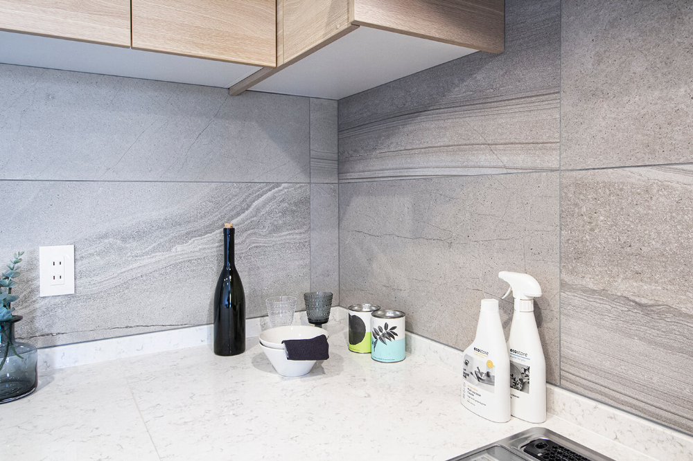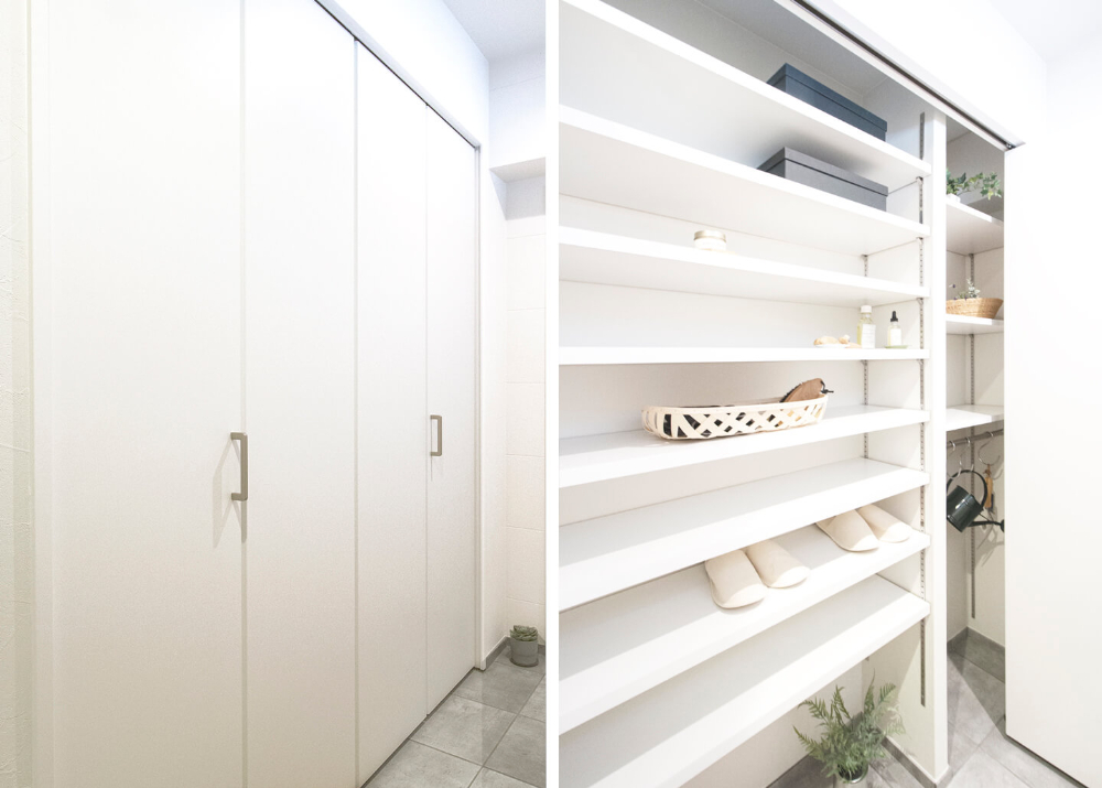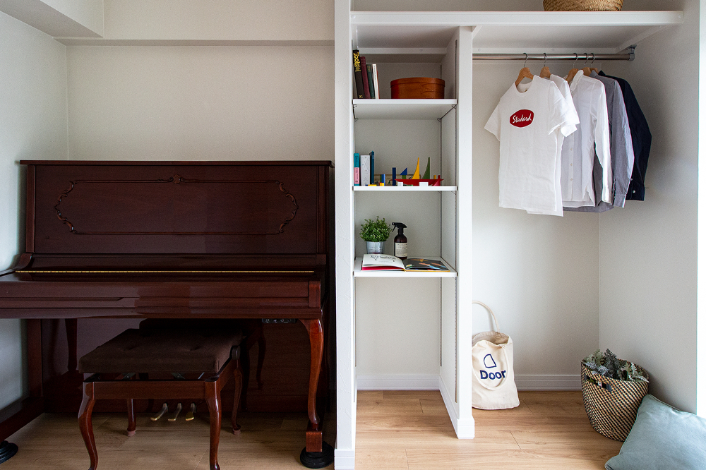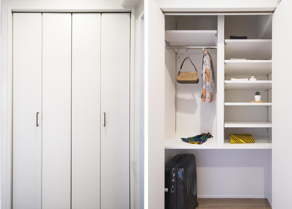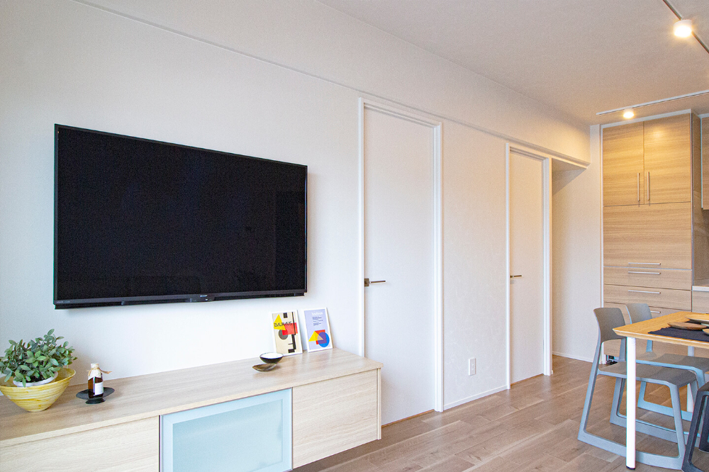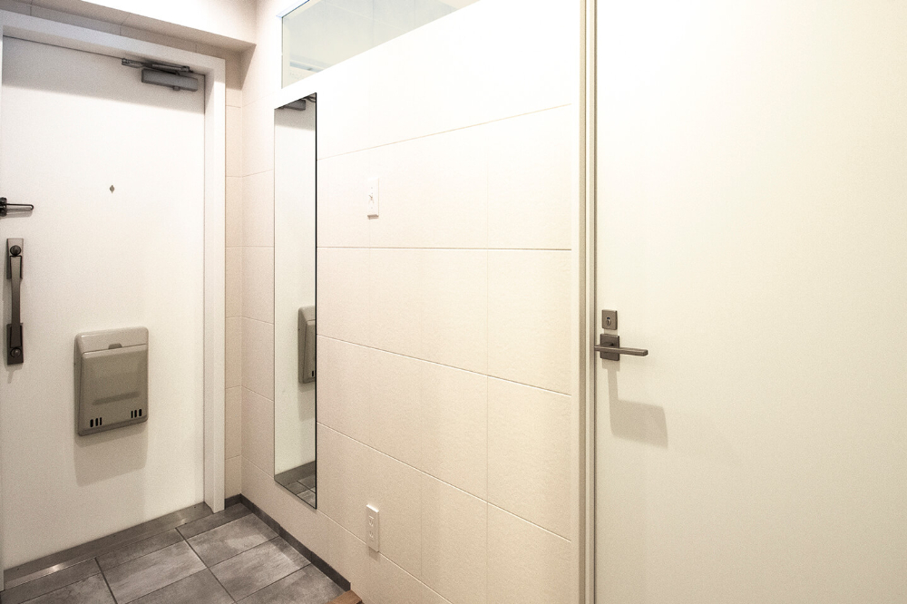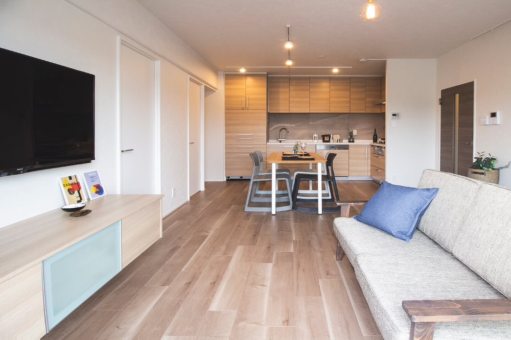 大阪府豊中市、築38年の中古マンションをリノベーション。ご夫婦の寝室となる壁面の高い位置にクリアガラスの窓を設け、グレーベージュカラーのカーペットでホテルライクな室内が覗く開放的な印象に。キッチンは温かみのある木調で仕上げ、壁面に大理石のようなマーブルデザインの大判パネルを組み合わせ高級感のあるダイニングとなりました。リビングに隣接する左右の扉は2人のお子様それぞれの子供部屋で、引き戸の収納棚やロールスクリーンで開閉する棚を設置。エントランスとホールには長めの扉付きの棚を設け、スーツケースも置くことが出来る大容量の収納スペースを確保。ホワイトやグレイッシュトーンで全体のバランスを保ちながら、シンプルな中にも上品に魅せる空間となりました。
