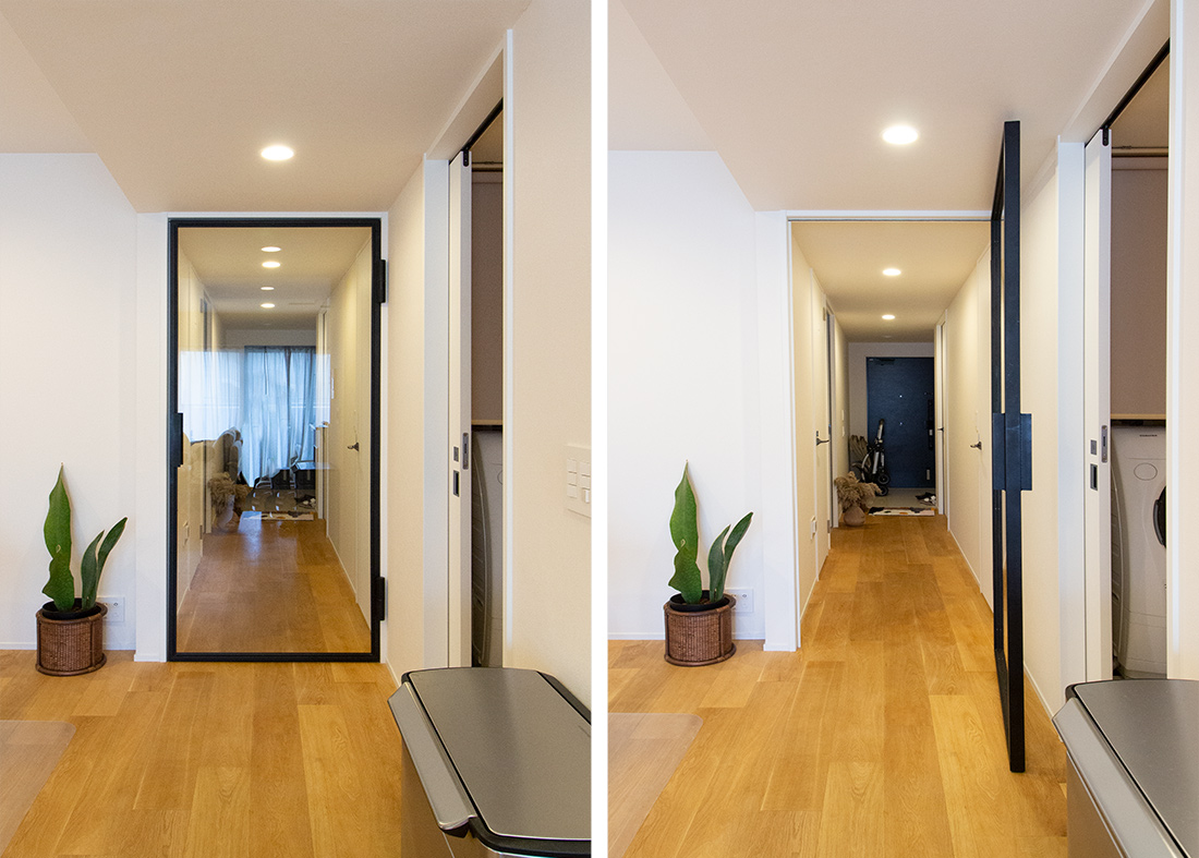 大阪府大阪市、新築マンションをリノベーション。リビングの扉の位置を変更し、洗面室をリビング内に設置することで、小さいお子様をいつも見守りながら家事ができる導線に。キッチン床には、カラートーンの異なるヘキサゴンタイルをしきつめ、シンプルでデザイン性あるキッチン空間に。洗面室とキッチンは、奥様が毎日を楽しめるデザインに。廊下とリビングを繋ぐガラス扉が、 光を取り込み空間全体を広く感じさせてくれるポイント。リビングの壁一面に設置したシェルフには、レコードや家族のお気に入りのフラワーベースを飾り、見せる収納ですっきりした空間を作り上げました。