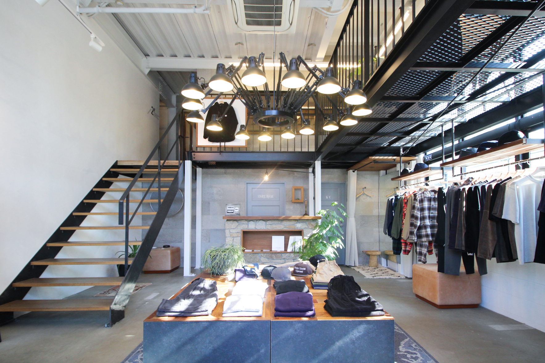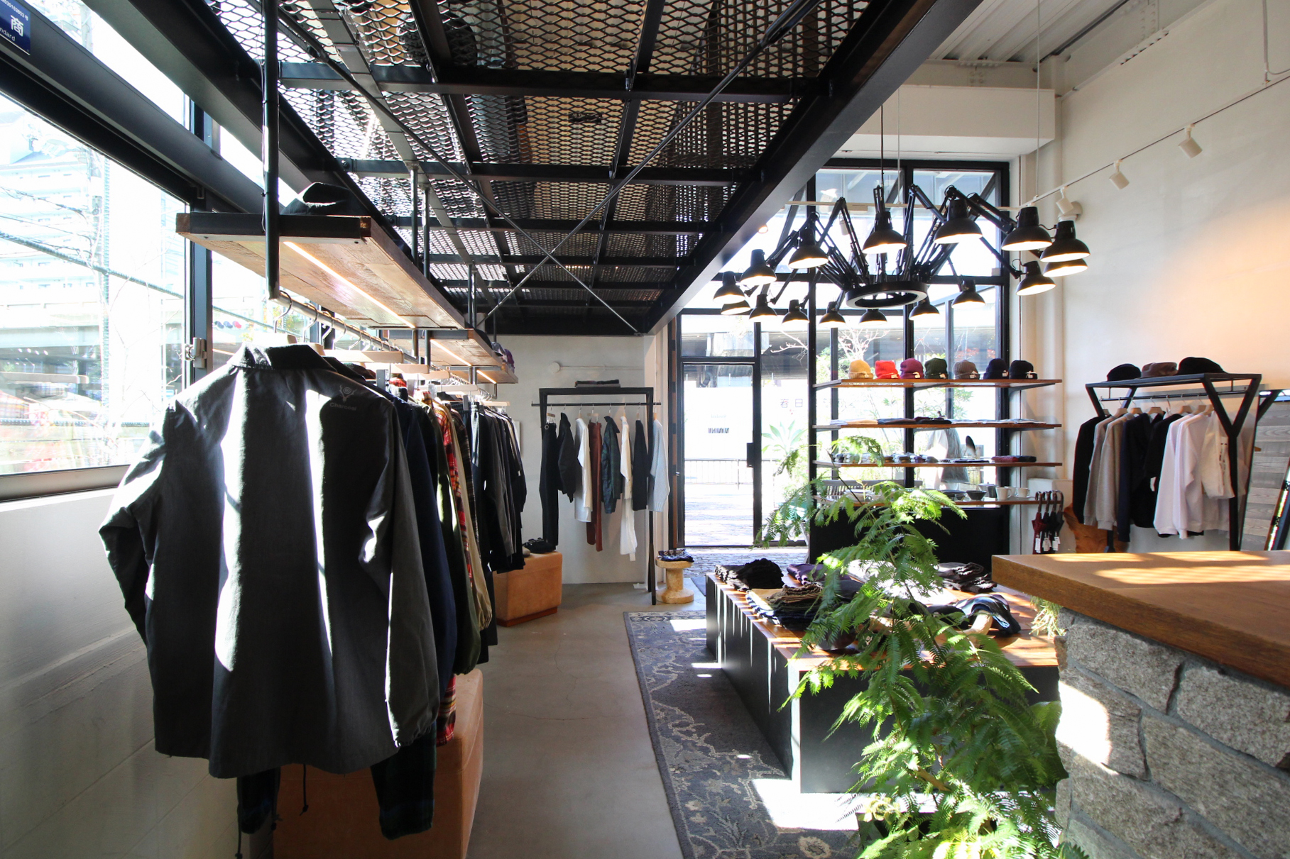 Standard本社1Fのショップが、ライフスタイルを総合的に提案するお店として生まれ変わりました。天井高を活かして1フロアプラスするなど、リノベーションによって新たな空間へ。服を照らすライン照明が施されたハンガーラックや特徴的な形のアイアンラック、入口付近に設置した木とガラスの棚、天板に古材を使用した空間中央のディスプレイ什器。全てオリジナルでデザインするなど、細部にこだわりながらも照明や空調のダクトなどの工業製品の持つカタチをそのままに、シンプルで無機質な雰囲気に仕上げました。コンクリートのグレー、アイアンの黒、木の色味で統一されたシャープでバランスの良い空間にBang&Olufsenのスピーカーから流れる音楽がマッチします。アイアンとガラスのサンルームから光を取り込み2Fをメッシュの床にすることで明るく開放感のある居(衣)心地いい空間となりました。
