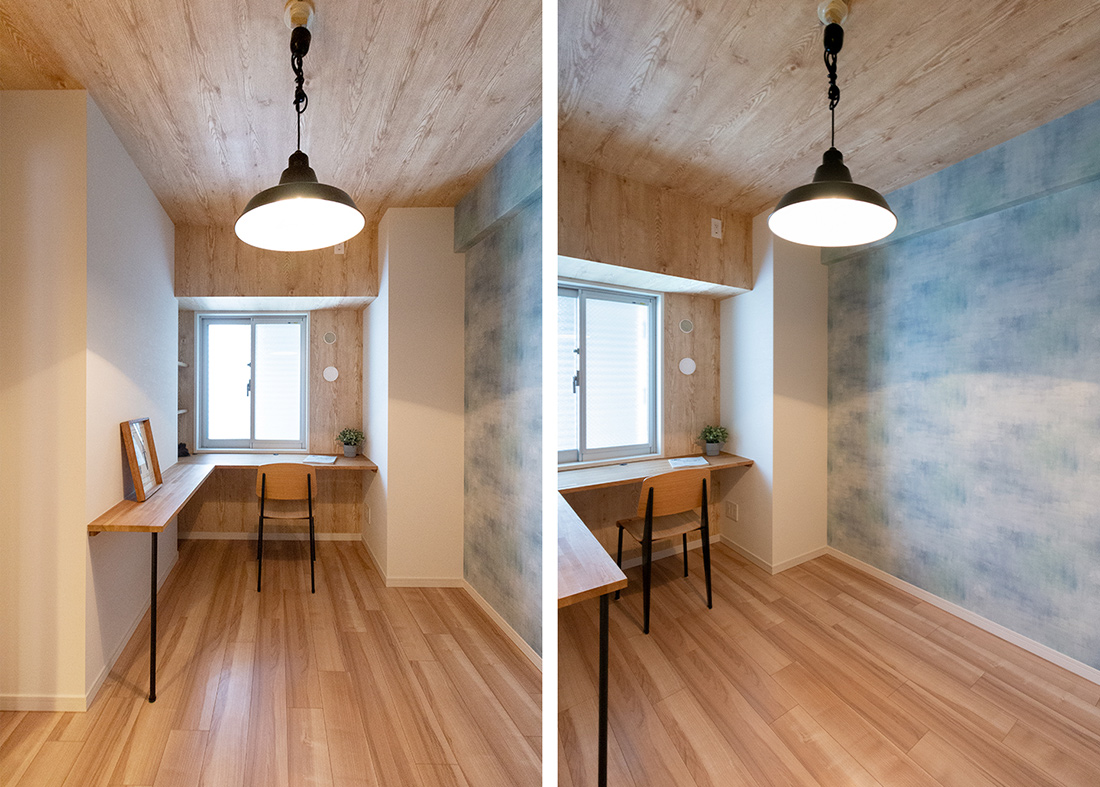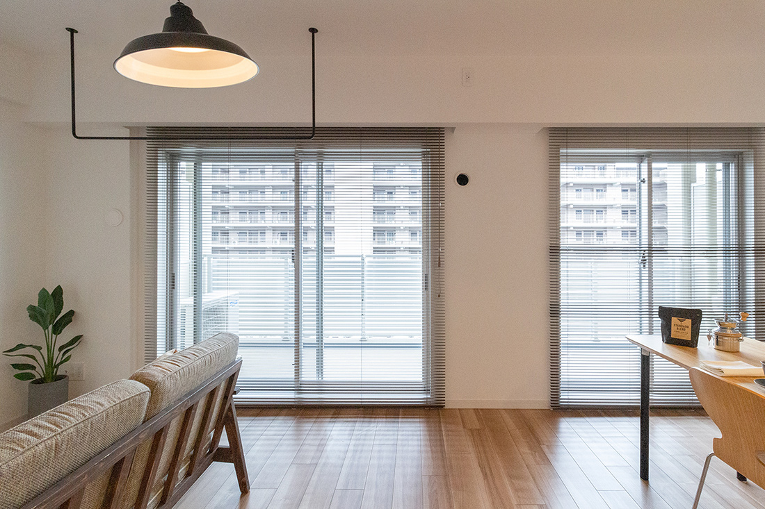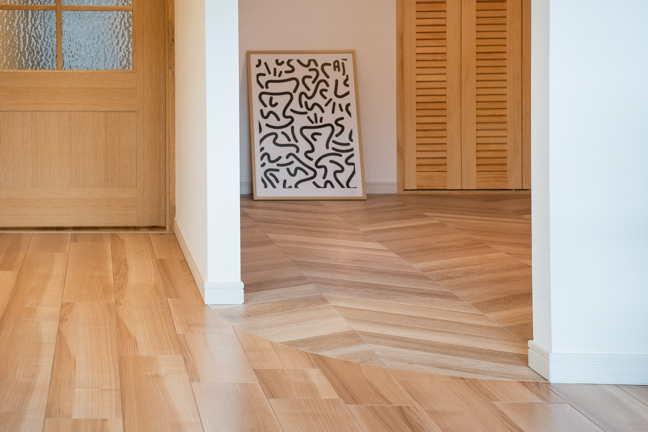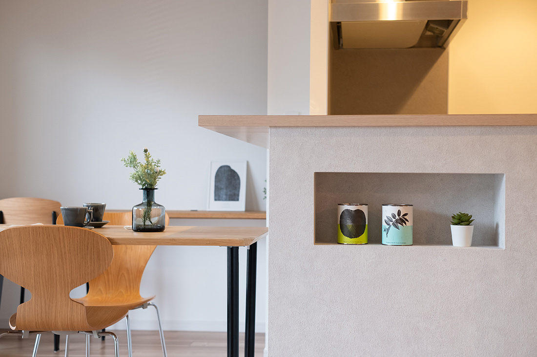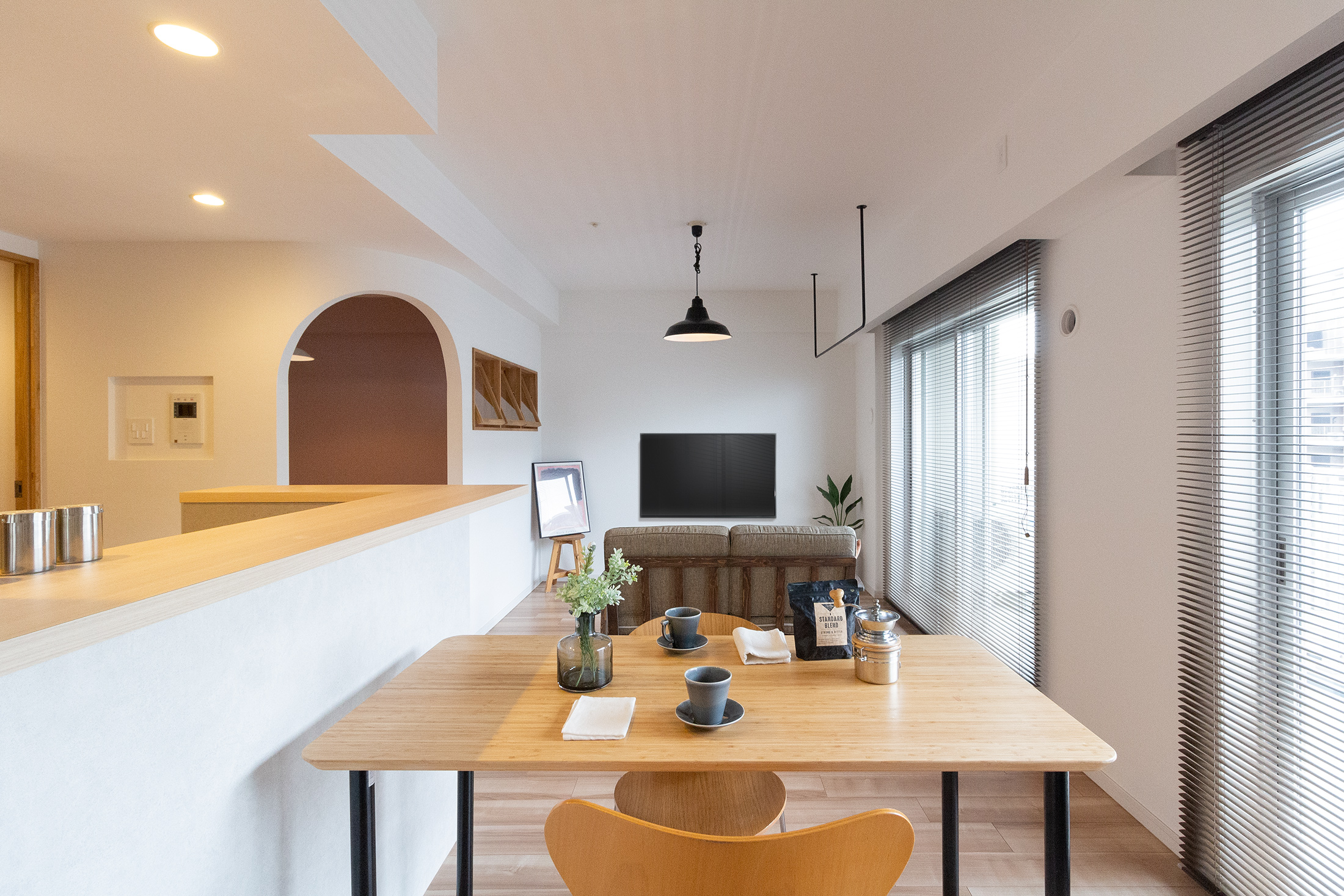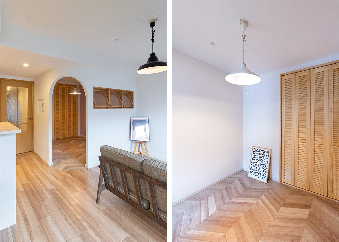 大阪府吹田市、築8年の中古マンションの部分リノベーション。曲線の壁にアーチ開口というstandard初のデザインがポイント。リビングの窓から取り込んだ光は室内回転窓を通して奥の個室にも届きます。曲線の壁に合わせて切り替えた床のヘリンボーンデザインや回転窓のウッドの色味が、リビングとの程よいアクセントに。既存のキッチンには新たにニッチ付きのカウンターを設け、グレーで統一したシンプルかつ機能的なデザインとしました。ワークルームは壁から天井まで続くウッドのクロスとブルーのアクセントクロスがポイント。立体感ある洗面台のホワイトタイルは既存のミラーに合わせたチョイス。それぞれの部屋に遊び心あるデザインを取り入れながらも統一感のある、居心地いいリノベーション空間となりました。