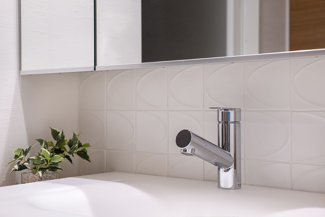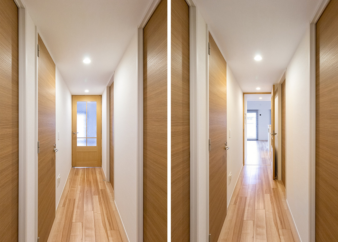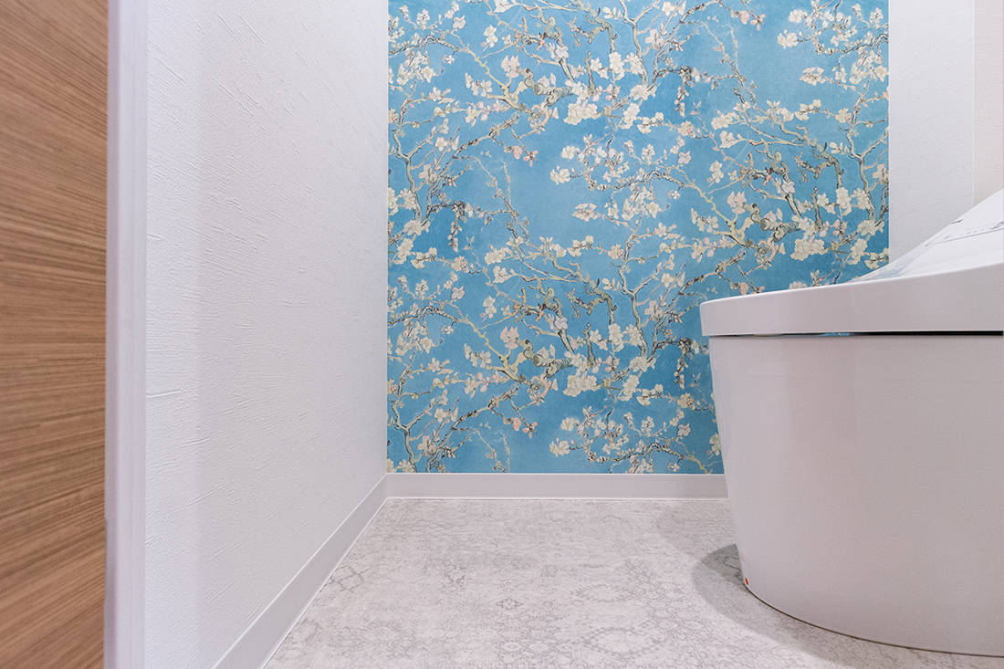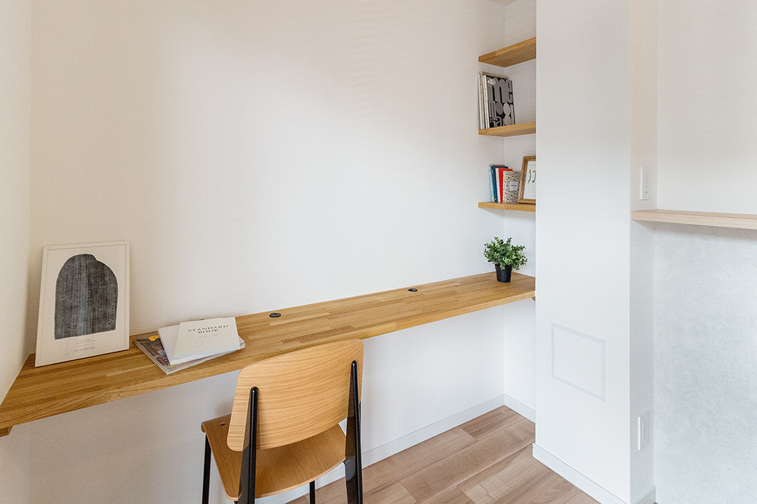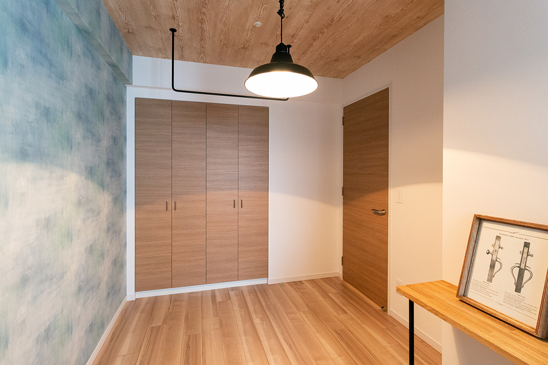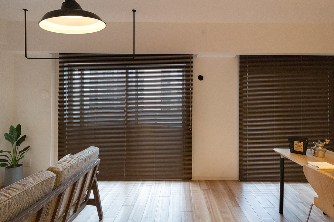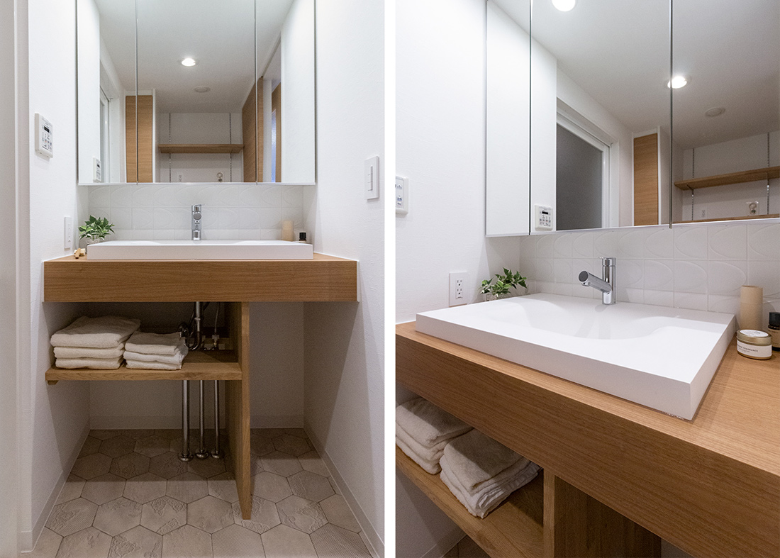 大阪府吹田市、築8年の中古マンションの部分リノベーション。曲線の壁にアーチ開口というstandard初のデザインがポイント。リビングの窓から取り込んだ光は室内回転窓を通して奥の個室にも届きます。曲線の壁に合わせて切り替えた床のヘリンボーンデザインや回転窓のウッドの色味が、リビングとの程よいアクセントに。既存のキッチンには新たにニッチ付きのカウンターを設け、グレーで統一したシンプルかつ機能的なデザインとしました。ワークルームは壁から天井まで続くウッドのクロスとブルーのアクセントクロスがポイント。立体感ある洗面台のホワイトタイルは既存のミラーに合わせたチョイス。それぞれの部屋に遊び心あるデザインを取り入れながらも統一感のある、居心地いいリノベーション空間となりました。