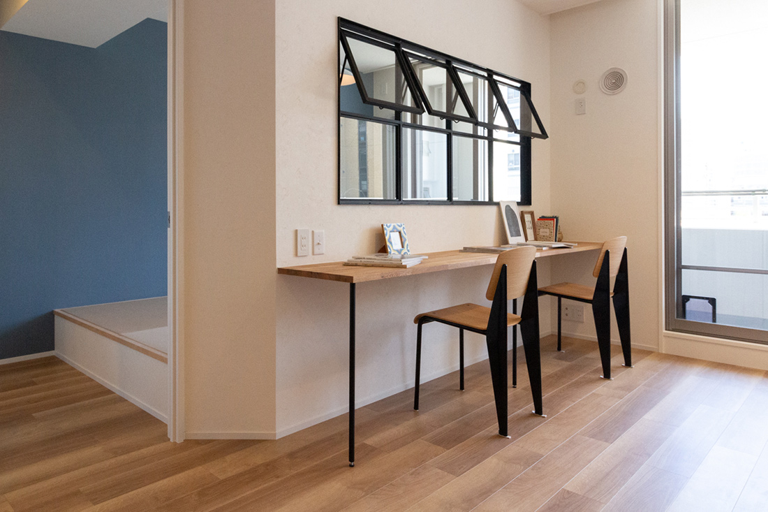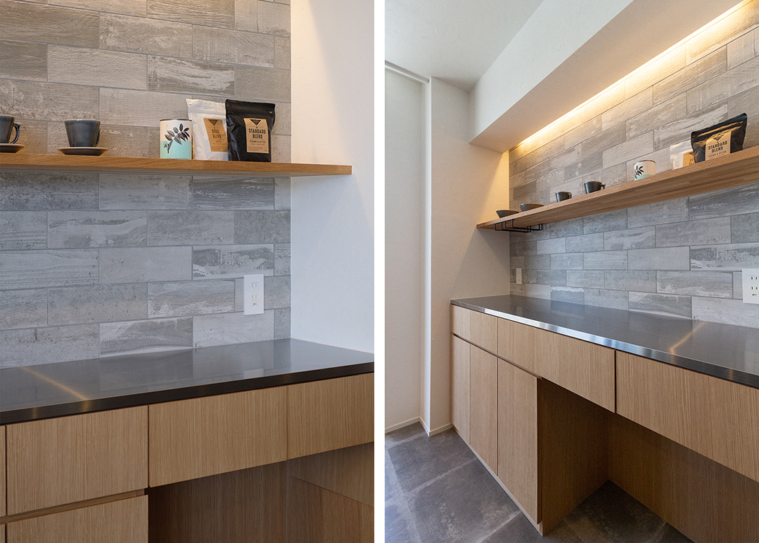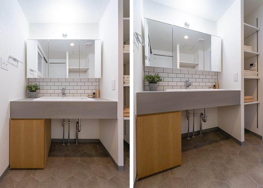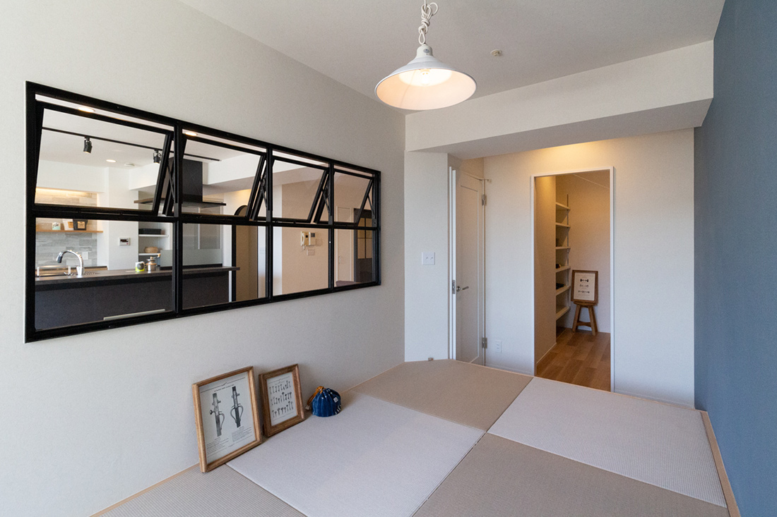 大阪府堺市、築19年の中古マンションリノベーション。タイルと照明がアクセントとなりシンプルながら個性あるリビング。一段上がったアイランド型キッチンの空間には、ステンレスの天板を使用したオリジナルのカップボードと、美しいタイルの飾り棚を。天井からの間接照明が棚に飾った器を照らし高級感を演出。 アーチ開口の曲線デザインが目を引くパントリーは冷蔵庫のスペースも設けた広さある収納空間で、キッチンをよりスッキリと見せることができます。アイアンの室内窓からLDKを見渡すことのできる和室は小上がりのデザインと畳下収納がポイント。ウォッシュルームは清潔感ある白のタイルとヘキサゴンデザインの床、モルタルでモノトーンにまとめ、落ち着いた雰囲気に。キッチン、リビング、ウォッシュルームまで様々なタイルと素材でメリハリあるリノベーション空間となりました。